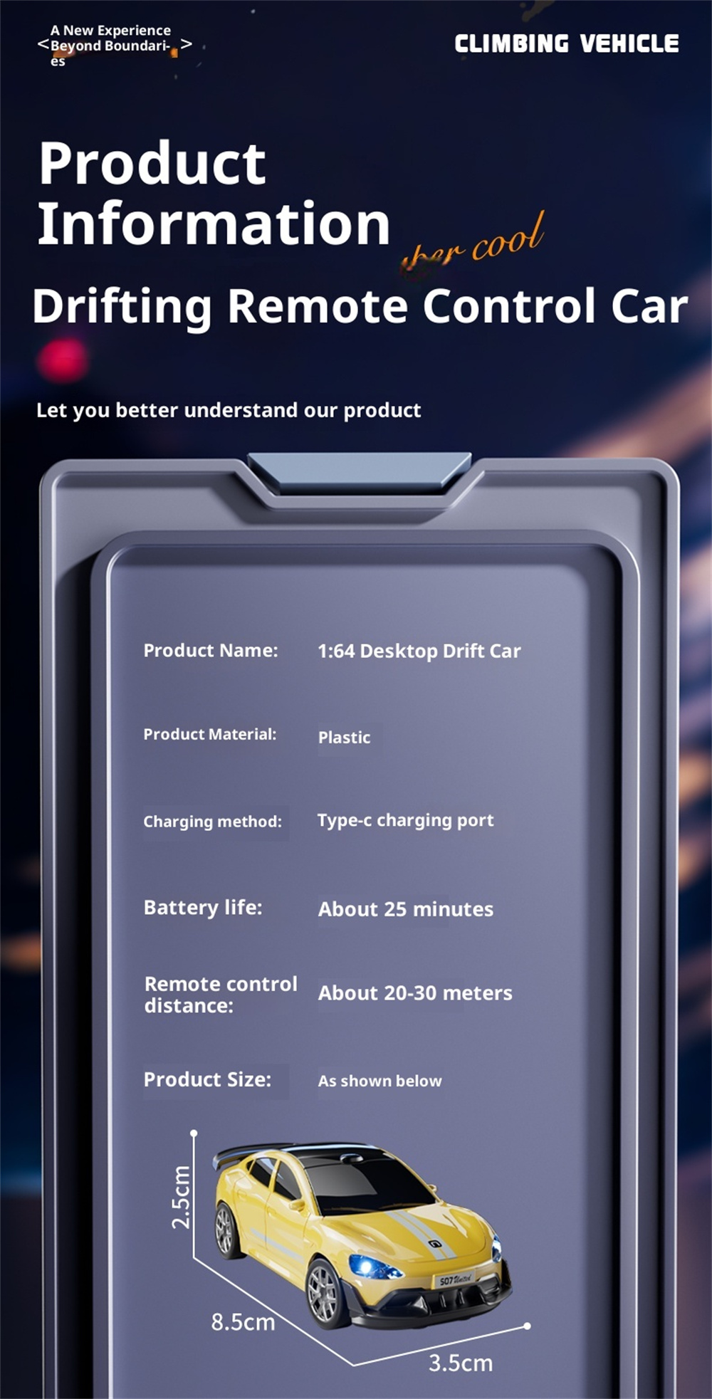 Car Size:8.5*3.5*2.5cm Remote Controller Size:8.3*5.7cm Box Size:14*10*12cm |