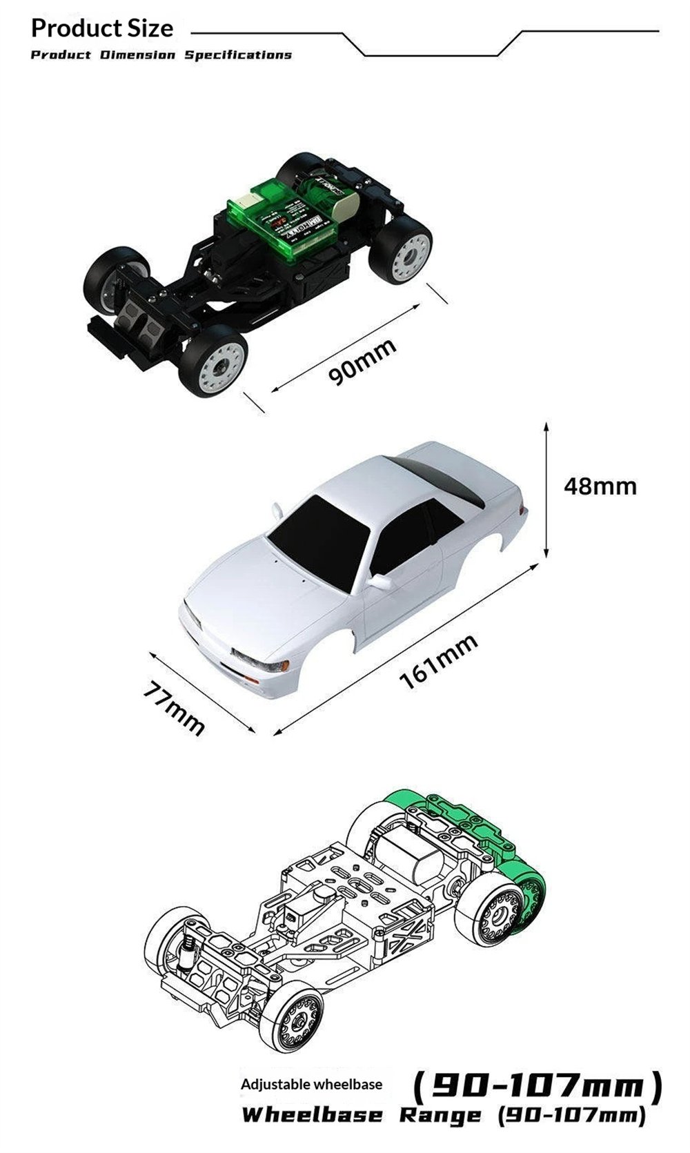 Car Size:167*77*48mm Wheelbase:90-107mm |