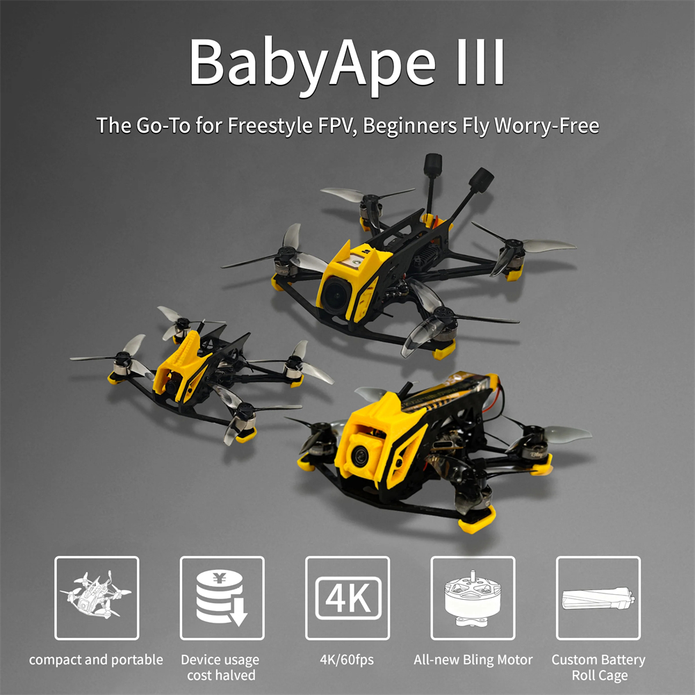 The all-new, evolved BabyApe III series launches with three models: the 2” Mini, 3” Standard, and 3.5” Pro—all featuring a lightweight Sub<250g design. It inherits the ‘high cost-performance’ DNA of its two predecessors, while achieving full upgrades in image quality, configuration, and crash resistance. From ready-to-fly kits to spare parts, and from initial setup to post-purchase maintenance, we reduce the cost of FPV drone ownership at every step. Focused on ‘affordability, ease of use, and portable convenience,’ it stands as a benchmark choice for beginners stepping into FPV drones.