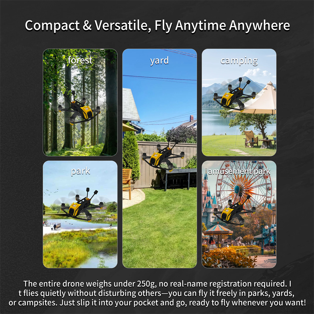 The entire drone weighs under 250g, no real-name registration required. It flies quietly without disturbing others—you can fly it freely in parks, yards, or campsites. Just slip it into your pocket and go, ready to fly whenever you want!