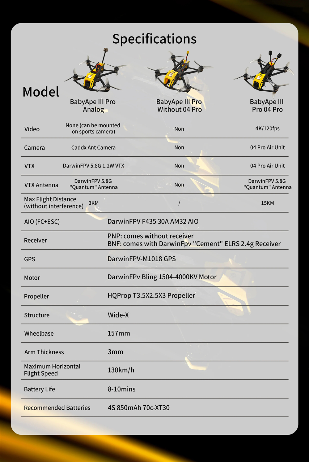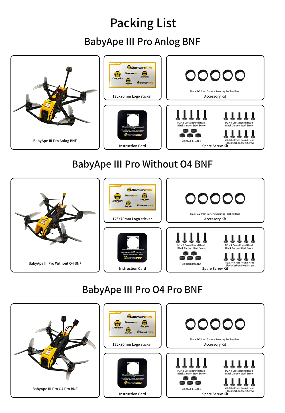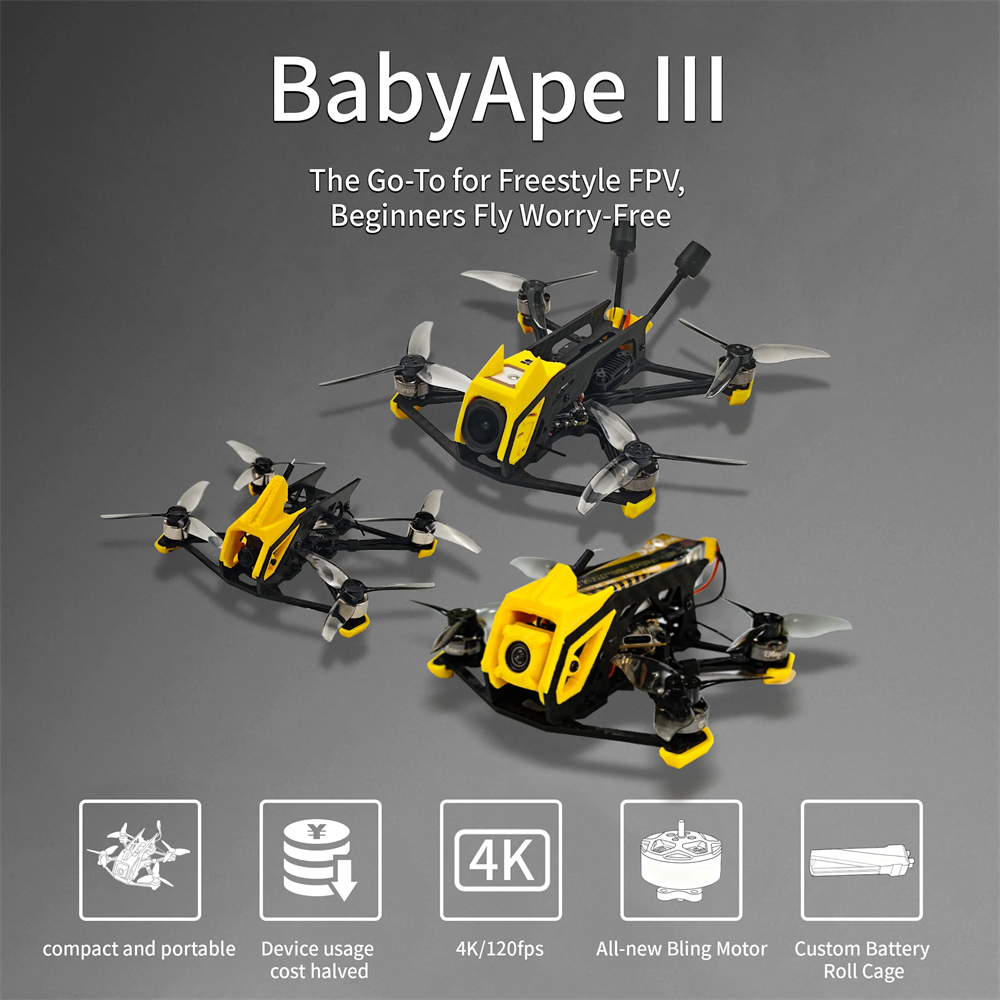 The all-new, evolved BabyApe III series launches with three models: the 2” Mini, 3” Standard, and 3.5” Pro—all featuring a lightweight Sub<250g design. It inherits the ‘high cost-performance’ DNA of its two predecessors, while achieving full upgrades in image quality, configuration, and crash resistance. From ready-to-fly kits to spare parts, and from initial setup to post-purchase maintenance, we reduce the cost of FPV drone ownership at every step. Focused on ‘affordability, ease of use, and portable convenience,’ it stands as a benchmark choice for beginners stepping into FPV drones.