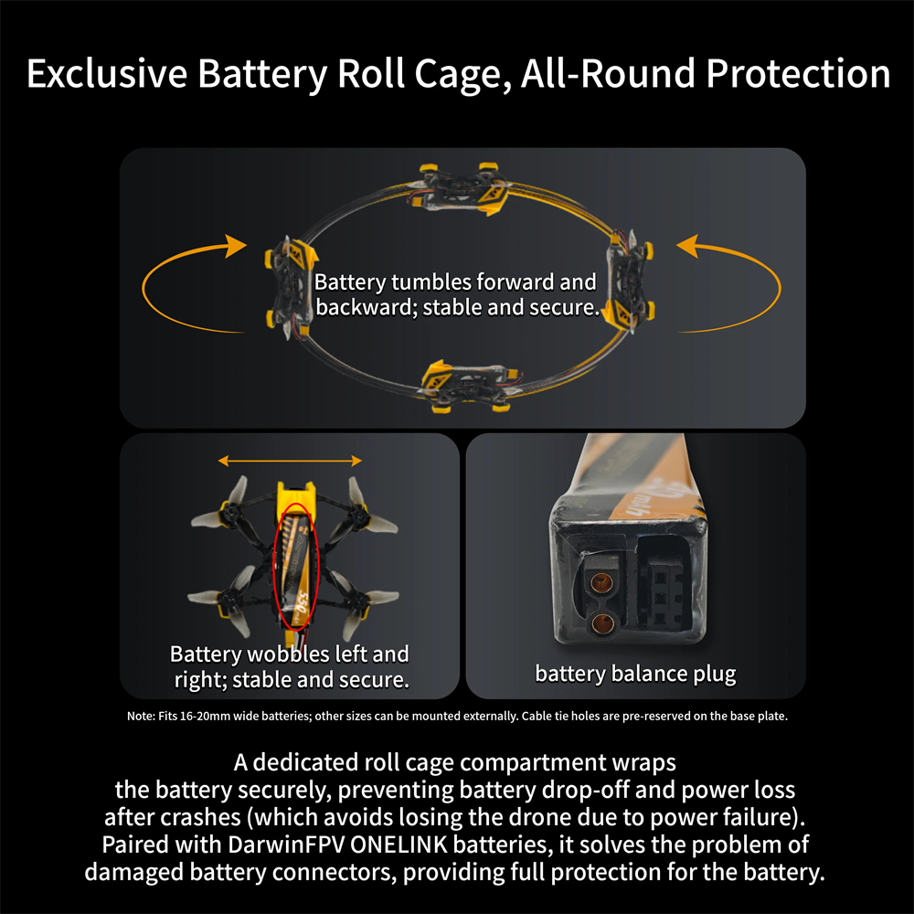 A dedicated roll cage compartment wraps the battery securely, preventing battery drop-off and power loss after crashes (which avoids losing the drone due to power failure). Paired with DarwinFPV ONELINK batteries, it solves the problem of damaged battery connectors, providing full protection for the battery. (Note: Fits 16-22mm wide batteries; other sizes can be mounted externally. Cable tie holes are pre-reserved on the base plate.)
