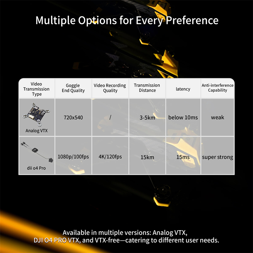 Available in multiple versions: Analog VTX, DJI O4 Pro Air Unit, and VTX-free—catering to different user needs.