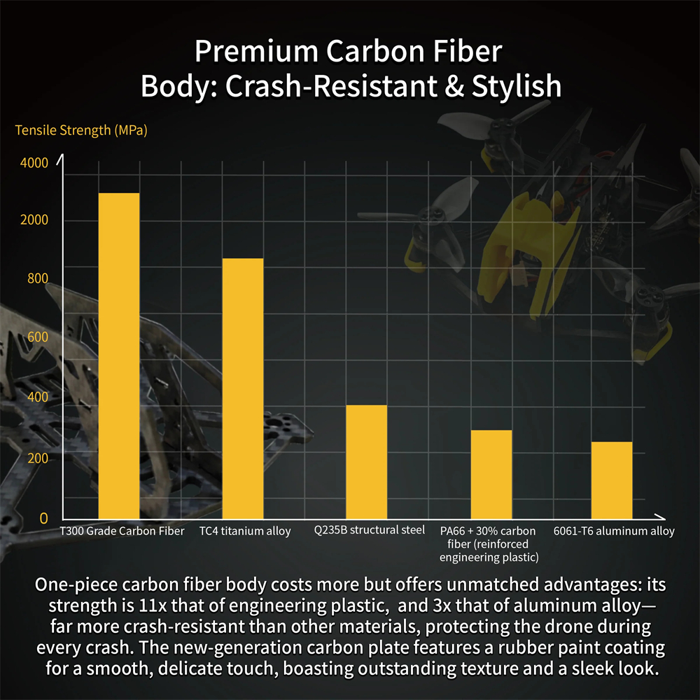 One-piece carbon fiber body costs more but offers unmatched advantages: its strength is 11x that of engineering plastic, 3x that of aluminum alloy—far more crash-resistant than other materials, protecting the drone during every crash. The new-generation carbon plate features a rubber paint coating for a smooth, delicate touch, boasting outstanding texture and a sleek look.