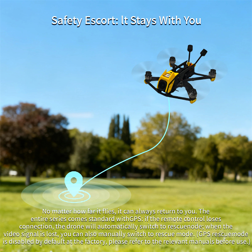 No matter how far you fly your drone, it’s protected—all models include this feature as standard. If the remote control becomes disconnected, the drone automatically glides back safely; if the video signal is lost, a manual rescue mode can also be activated. (Note: GPS rescue mode is factory-set to off. Please consult your user manual or guide before use.)