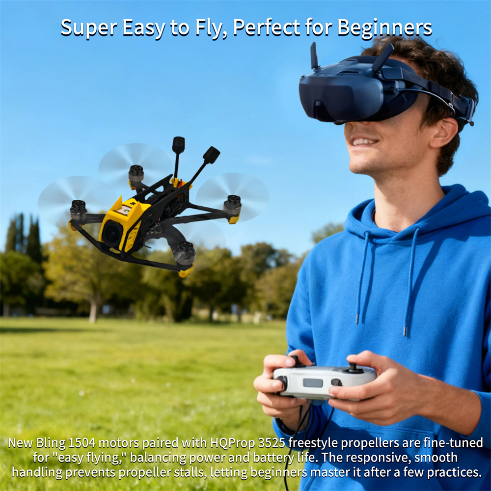 New Bling 1504 motors paired with HQProp 3525 propellers are fine-tuned for ‘easy flying,’ balancing power and battery life. The responsive, smooth handling prevents propeller stalls, letting beginners master it after a few practices.