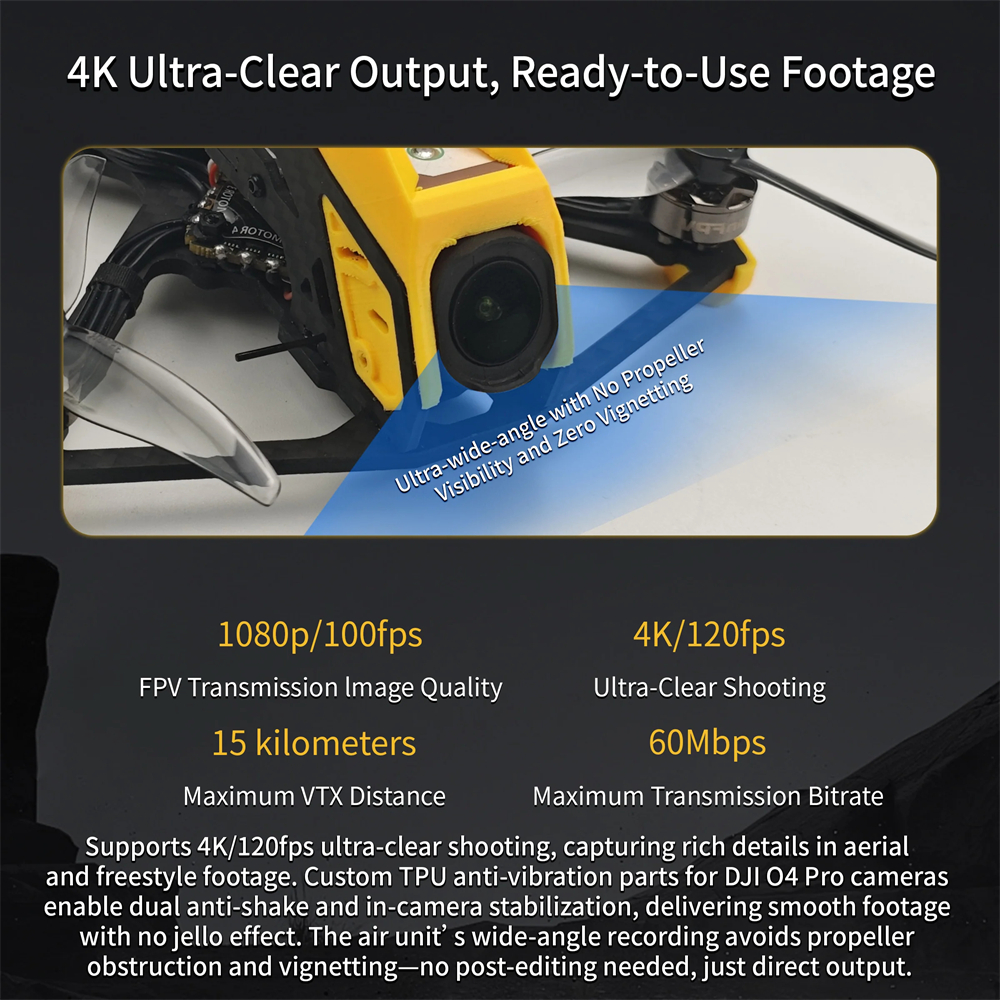 Supports 4K/120fps ultra-clear shooting, capturing rich details in aerial and freestyle footage. Custom TPU anti-vibration parts for DJI O4 Pro air unit enable dual anti-shake and in-camera stabilization, delivering smooth footage with no jello effect. The air unit’s wide-angle recording avoids propeller obstruction and vignetting—no post-editing needed, just direct output.