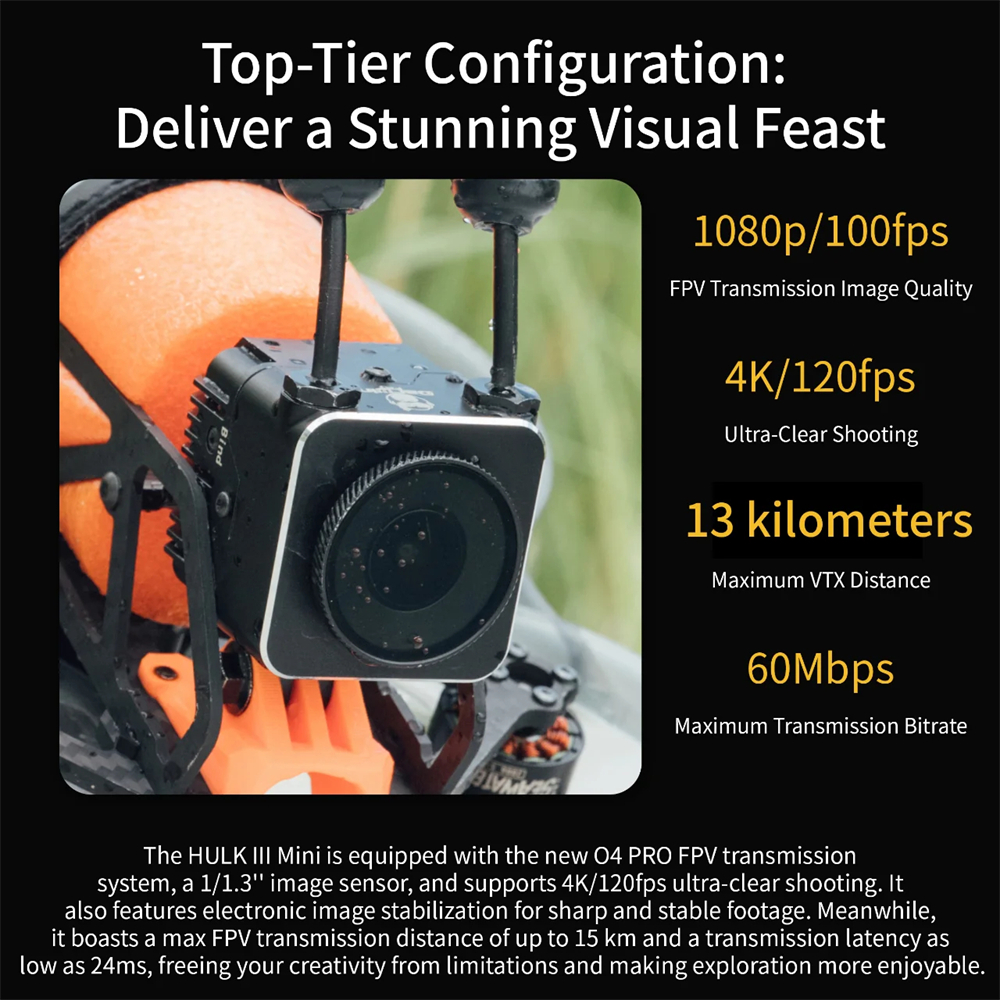 The HULK III Mini is equipped with the new O4 PRO FPV transmission system, a 1/1.3” image sensor, and supports 4K/120fps ultra-clear shooting. It also features electronic image stabilization for sharp and stable footage. Meanwhile, it boasts a max FPV transmission distance of up to 15 km and a transmission latency as low as 24ms, freeing your creativity from limitations and making exploration more enjoyable.