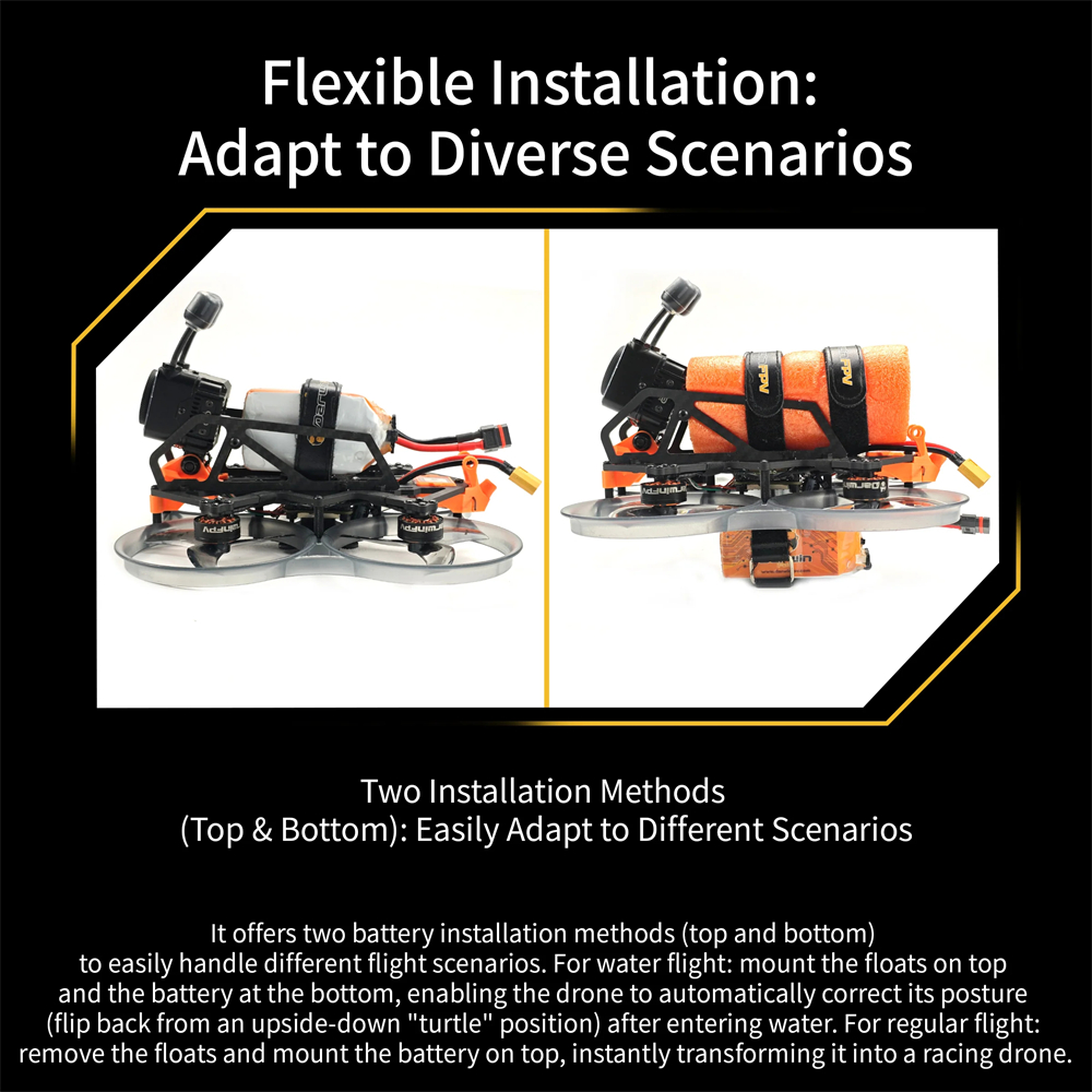It offers two battery installation methods (top and bottom) to easily handle different flight scenarios. For water flight: mount the floats on top and the battery at the bottom, enabling the drone to automatically correct its posture (flip back from an upside-down ‘turtle’ position) after entering water. For regular flight: remove the floats and mount the battery on top, instantly transforming it into a racing drone.