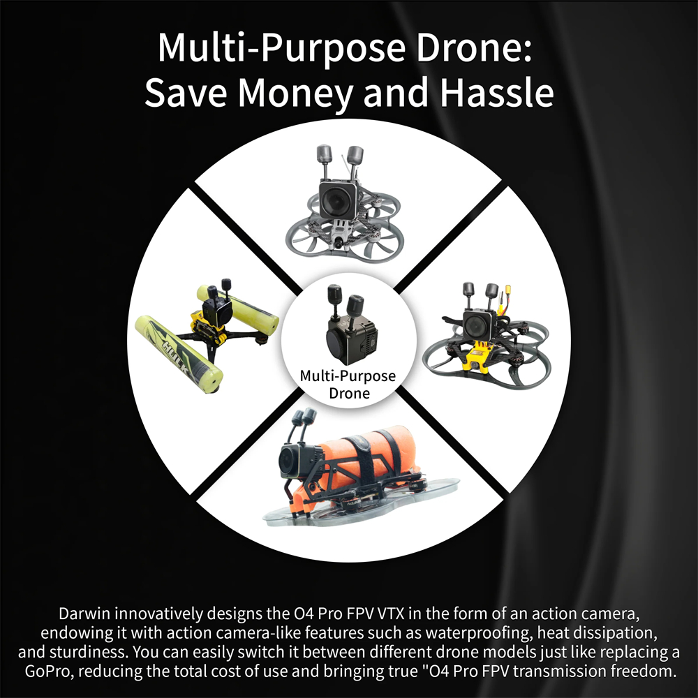 Darwin innovatively designs the O4 Pro FPV VTX in the form of an action camera, endowing it with action camera-like features such as waterproofing, heat dissipation, and sturdiness. You can easily switch it between different drone models just like replacing a GPro, reducing the total cost of use and bringing true ‘O4 Pro FPV transmission freedom.