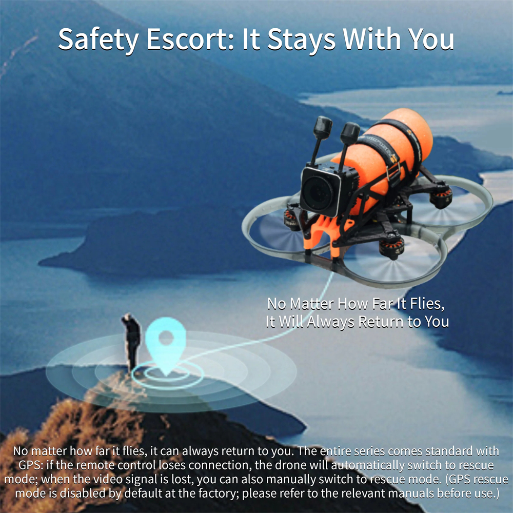 No matter how far it flies, it can always return to you. The entire series comes standard with GPS: if the remote control loses connection, the drone will automatically switch to rescue mode; when the video signal is lost, you can also manually switch to rescue mode. (GPS rescue mode is disabled by default at the factory; please refer to the relevant manuals before use.)