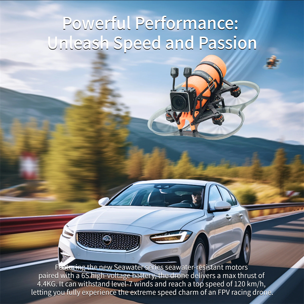 Featuring the new Seawater series seawater-resistant motors paired with a 6S high-voltage battery, the drone delivers a max thrust of 4.4KG. It can withstand level-7 winds and reach a top speed of 120 km/h, letting you fully experience the extreme speed charm of an FPV racing drone.