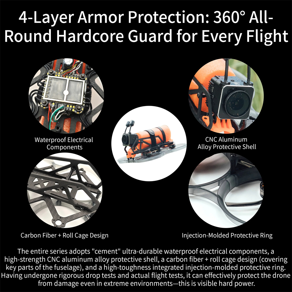 The entire series adopts ‘cement’ ultra-durable waterproof electrical components, a high-strength CNC aluminum alloy protective shell, a carbon fiber + roll cage design (covering key parts of the fuselage), and a high-toughness integrated injection-molded protective ring. Having undergone rigorous drop tests and actual flight tests, it can effectively protect the drone from damage even in extreme environments—this is visible hard power.