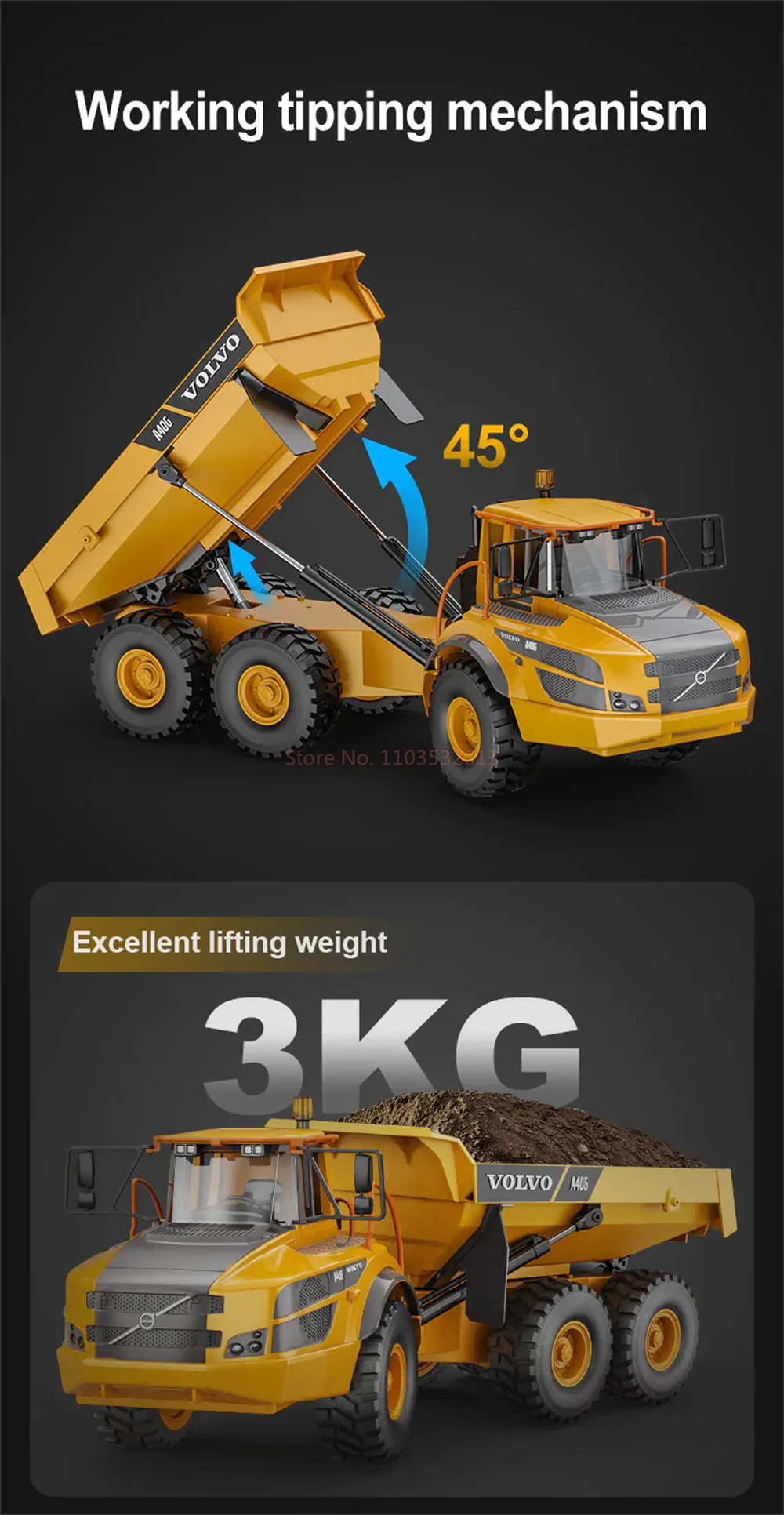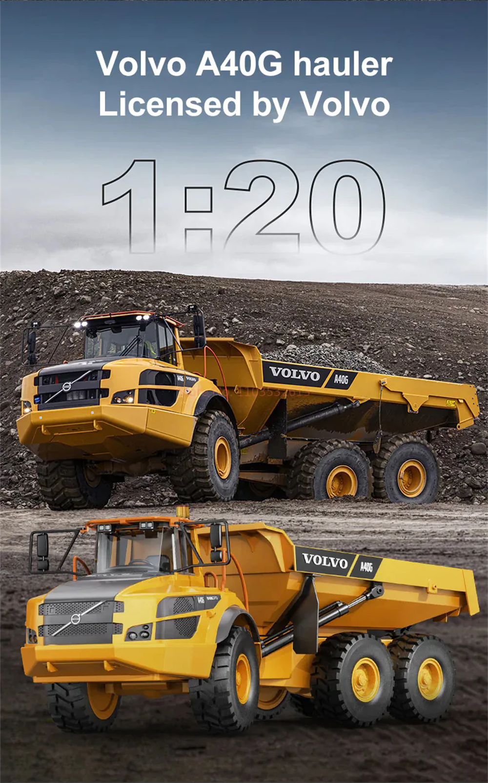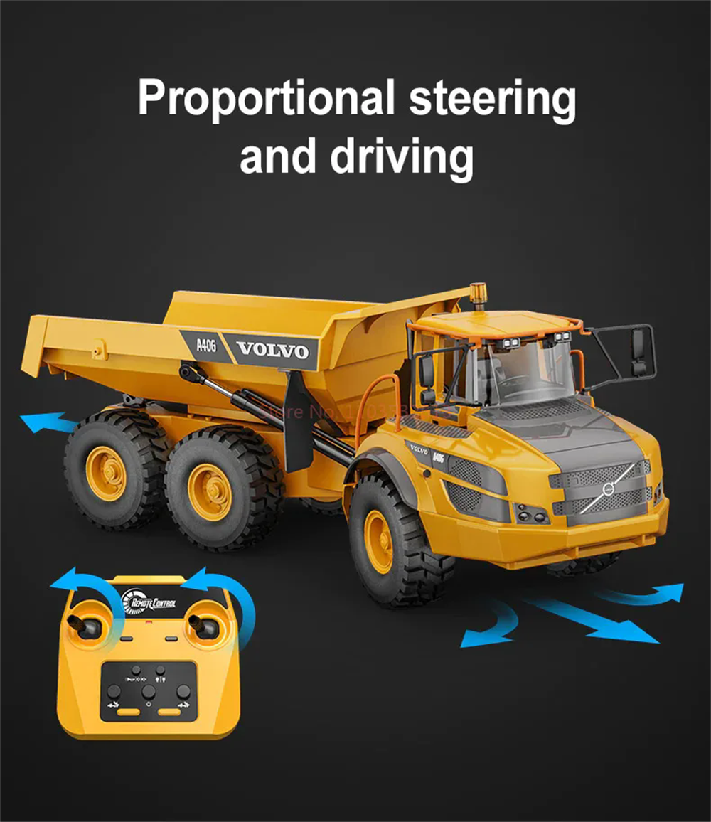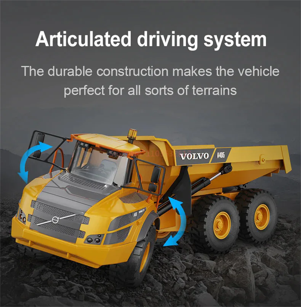 The Double E RC for Volvo Hauler truck E591 was designed as an upgrade for hobbyists who want more power and features. This remote control dump truck is powered by a 7.4V battery which gives it enough power for this vehicle to carry up 3kg of weight! The tipping bed angle was increased and with this model it can be raised up to 45 degrees. The efficient and stable transmission system offers great performance on all types of terrain, making it perfect for your next RC construction site adventure. The six wheel drive system on this construction truck allows it to move over obstacles even when fully loaded. The A40G’s suspension system enables it to smoothly navigate through any type of terrain with ease. With a proportional throttle and articulate steering, this model is easy to control during construction site operations. Working cab warning light is an excellent extra for more alike, realistic play experience!