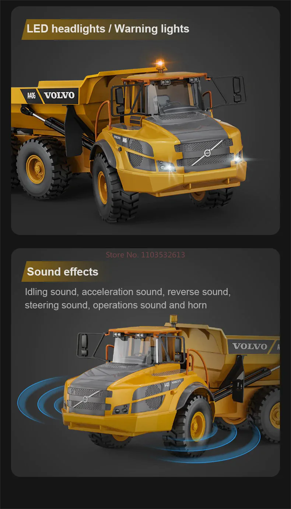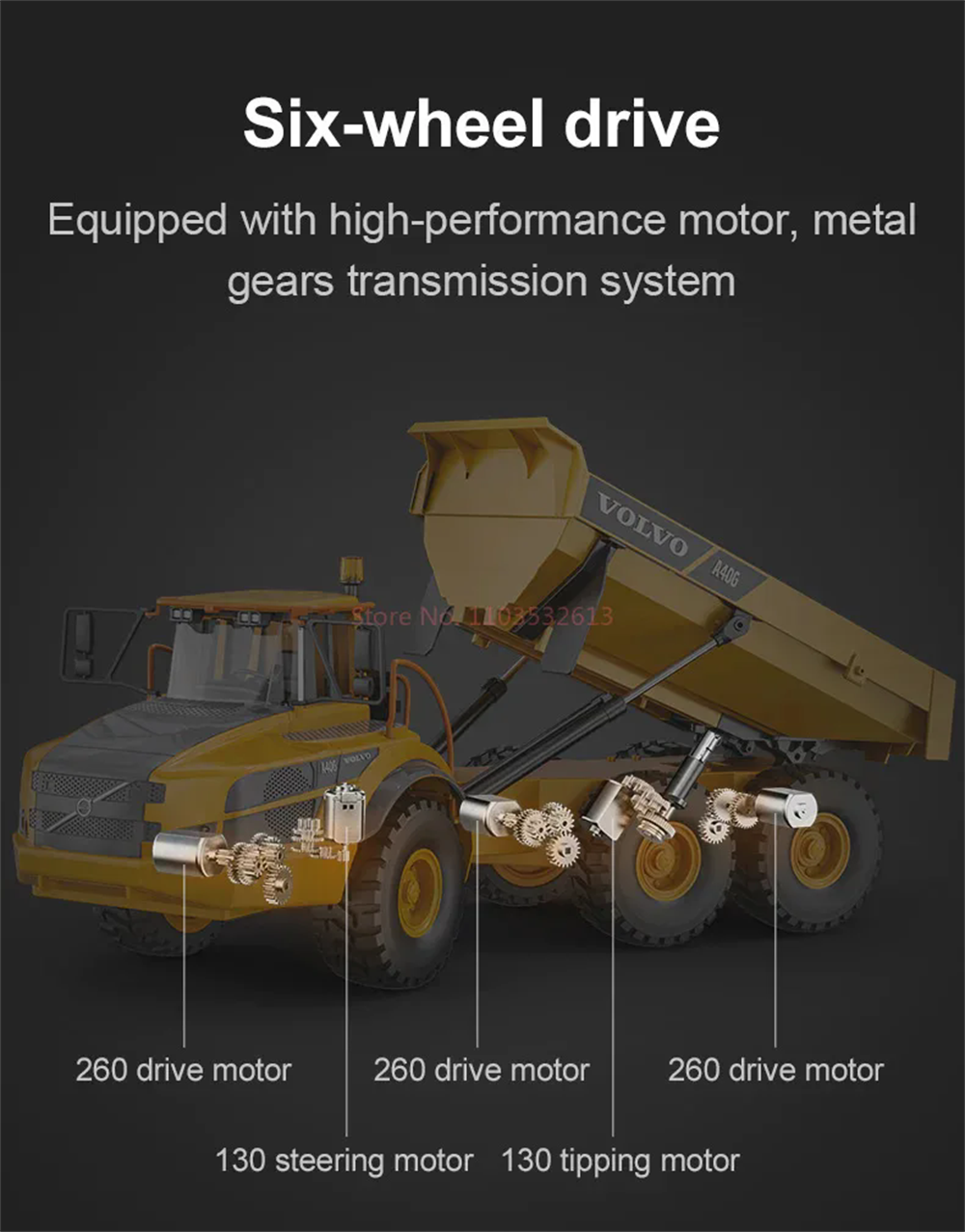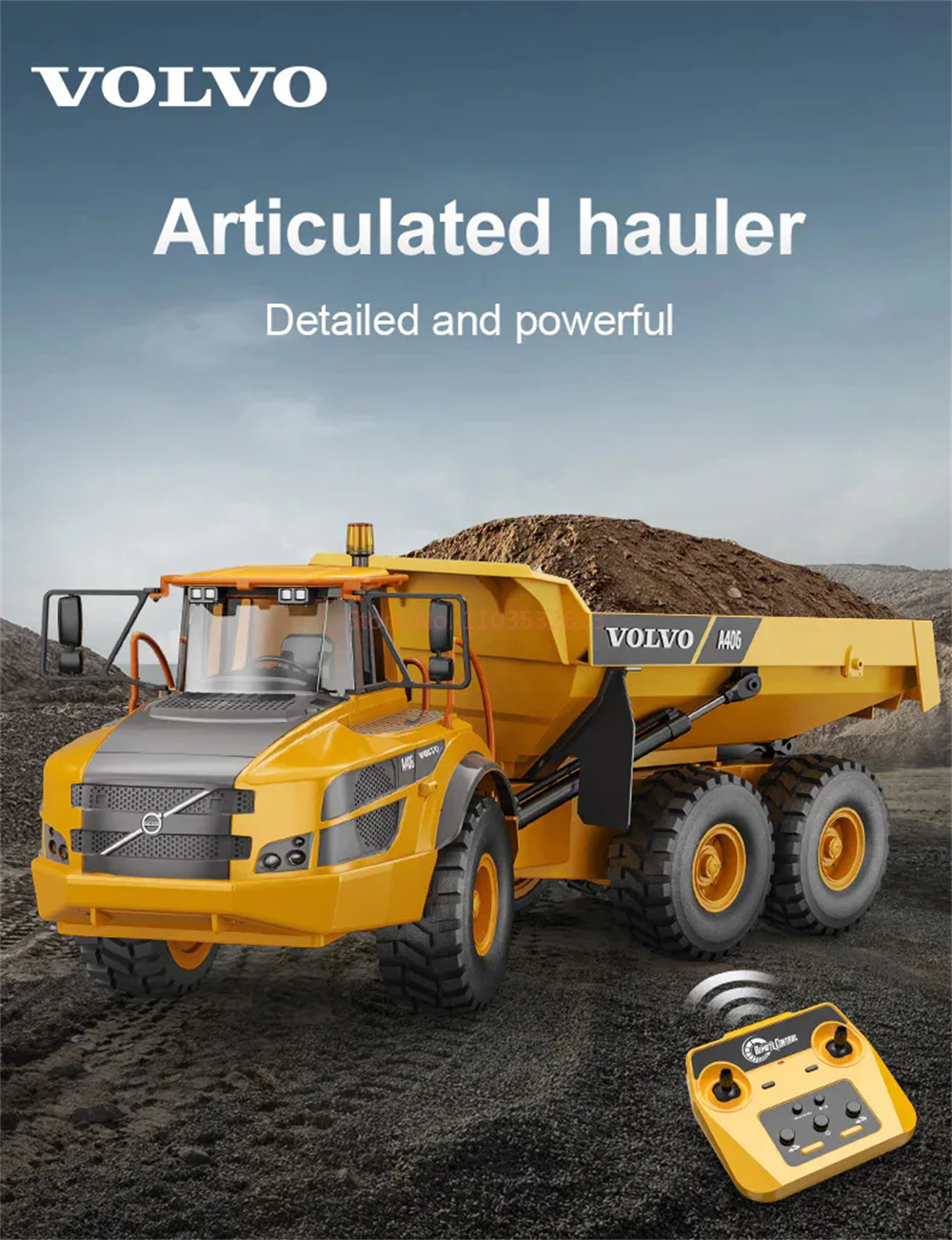The Double E RC for Volvo Hauler truck E591 was designed as an upgrade for hobbyists who want more power and features. This remote control dump truck is powered by a 7.4V battery which gives it enough power for this vehicle to carry up 3kg of weight! The tipping bed angle was increased and with this model it can be raised up to 45 degrees. The efficient and stable transmission system offers great performance on all types of terrain, making it perfect for your next RC construction site adventure. The six wheel drive system on this construction truck allows it to move over obstacles even when fully loaded. The A40G’s suspension system enables it to smoothly navigate through any type of terrain with ease. With a proportional throttle and articulate steering, this model is easy to control during construction site operations. Working cab warning light is an excellent extra for more alike, realistic play experience!