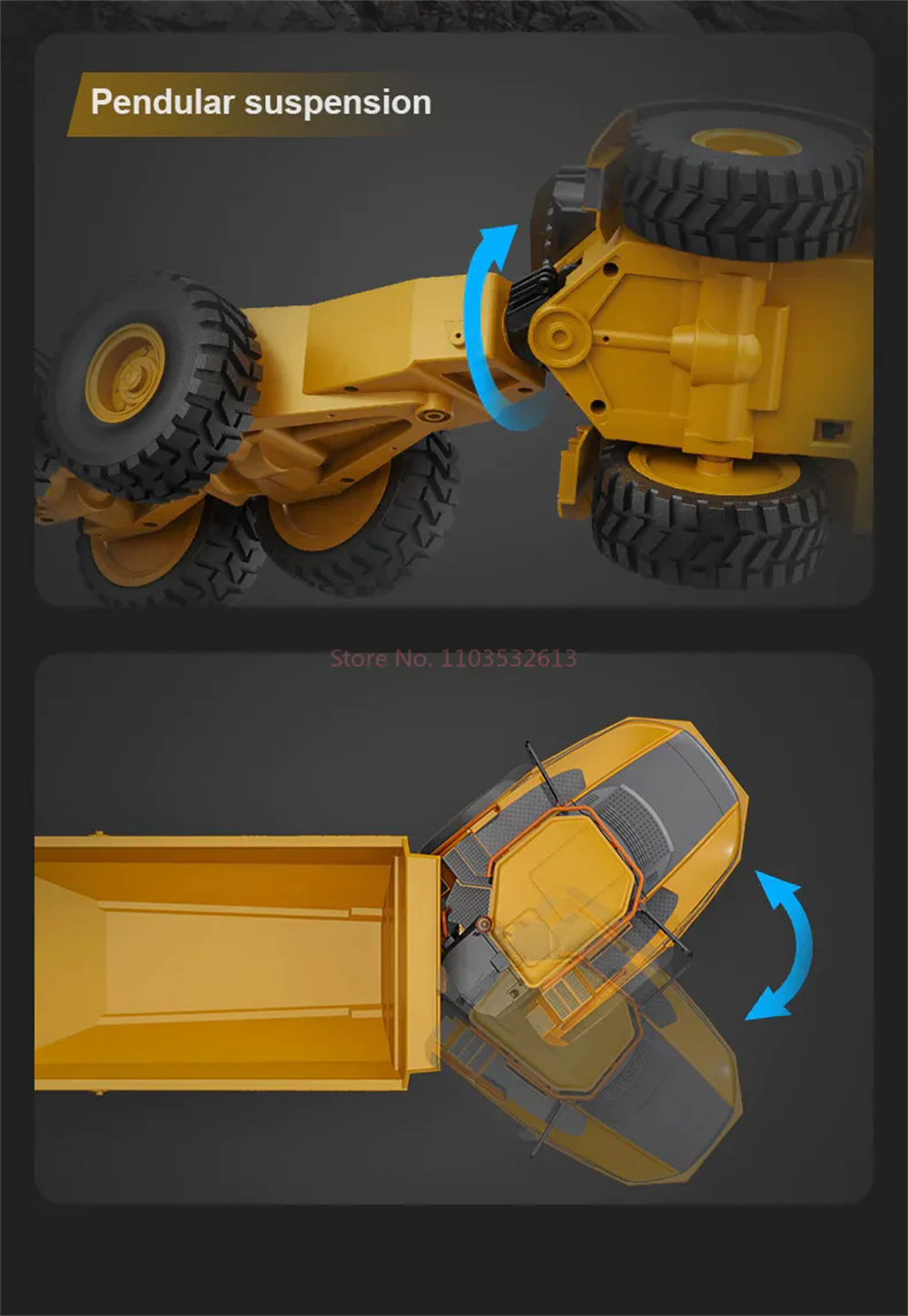 The 6-wheel drive system allows the A40G to easily overcome obstacles, even when fully loaded. Thanks to its sophisticated suspension system, the hauler moves smoothly over uneven terrain, providing a genuine construction site feel. Proportional throttle control and articulated steering ensure precise control, while the warning light above the cab adds an extra touch of realism.