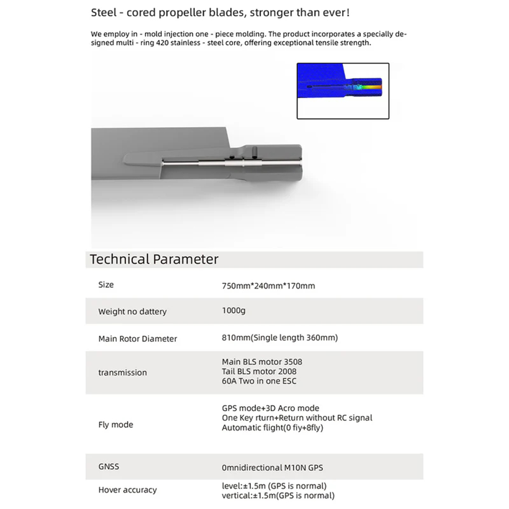 2 > Quick-Detachable Four-Propeller Rotor Head: for Enhanced Stability: Equipped with a FBL (flybarless) rotor structure, it delivers a smoother and more responsive feel than traditional 450L DFC models. The reinforced swashplate design adds flight stability, while the 470L-grade main and spindle shafts provide durability for intensive flight.