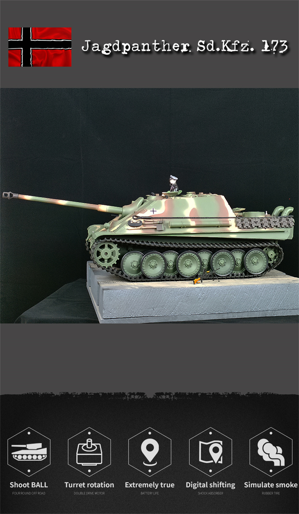 Forward, accelerate forward, backward, accelerate backward, rotate smoothly, fire BBs and recoil simultaneously, tube rises and falls 30 degrees, turret rotates 320 degrees, realistic sound and motion effects, full-scale remote control function, channels can be changed independently, multiple games can be played simultaneously, realistic smoke device, super chassis, realistic suspension system, realistic commander.