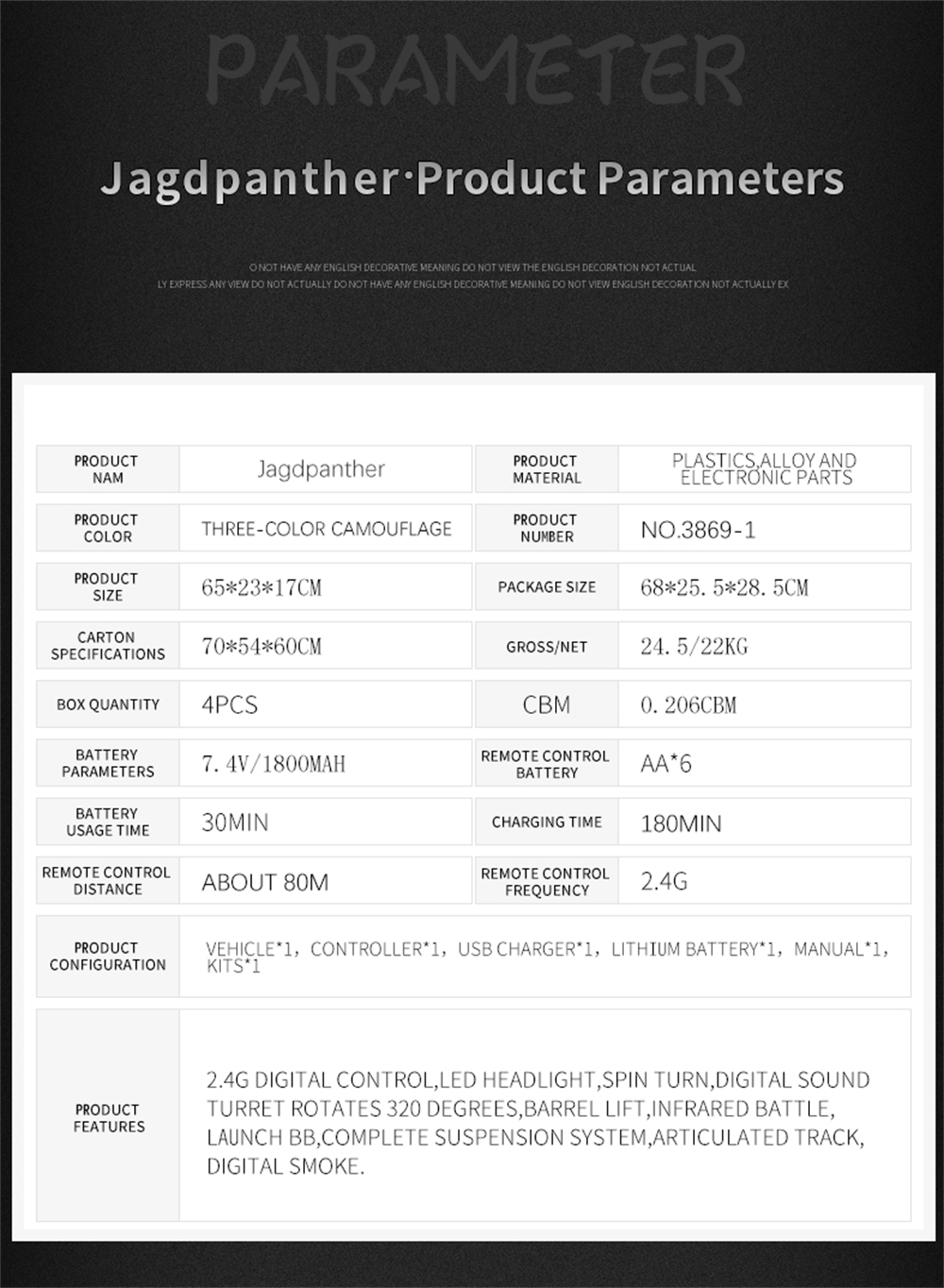 Brand: Heng Long Models:3869 Model:1/16 Speed:3km/h |