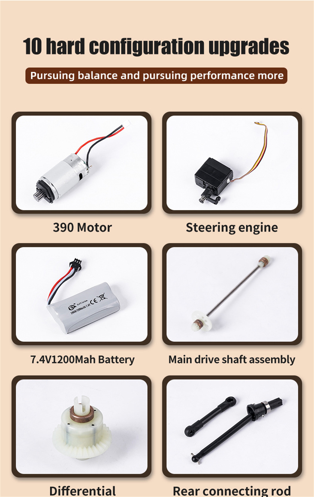 ESC:30A integrated control esc Motor:390 brushed motor Servo:2.2kg 5 wires steering servo |