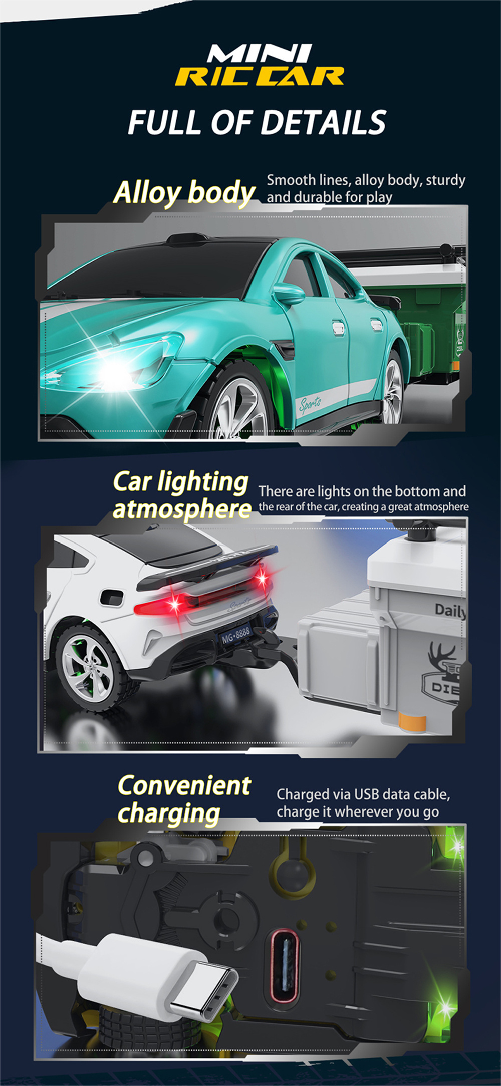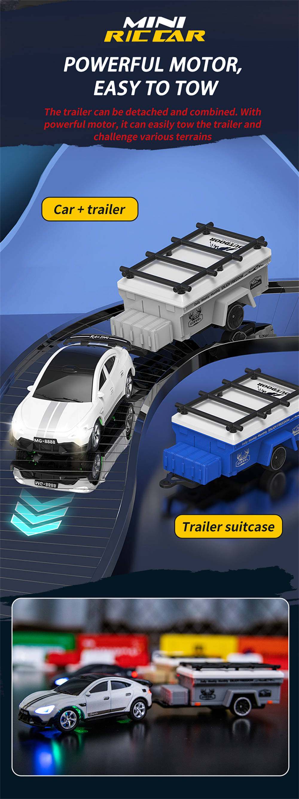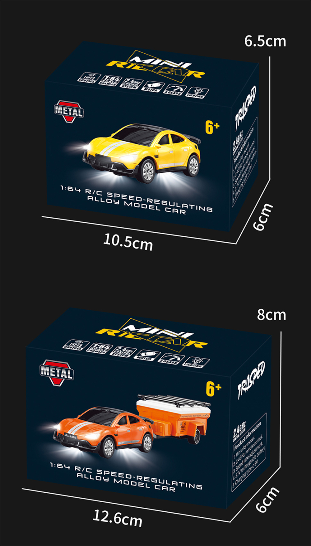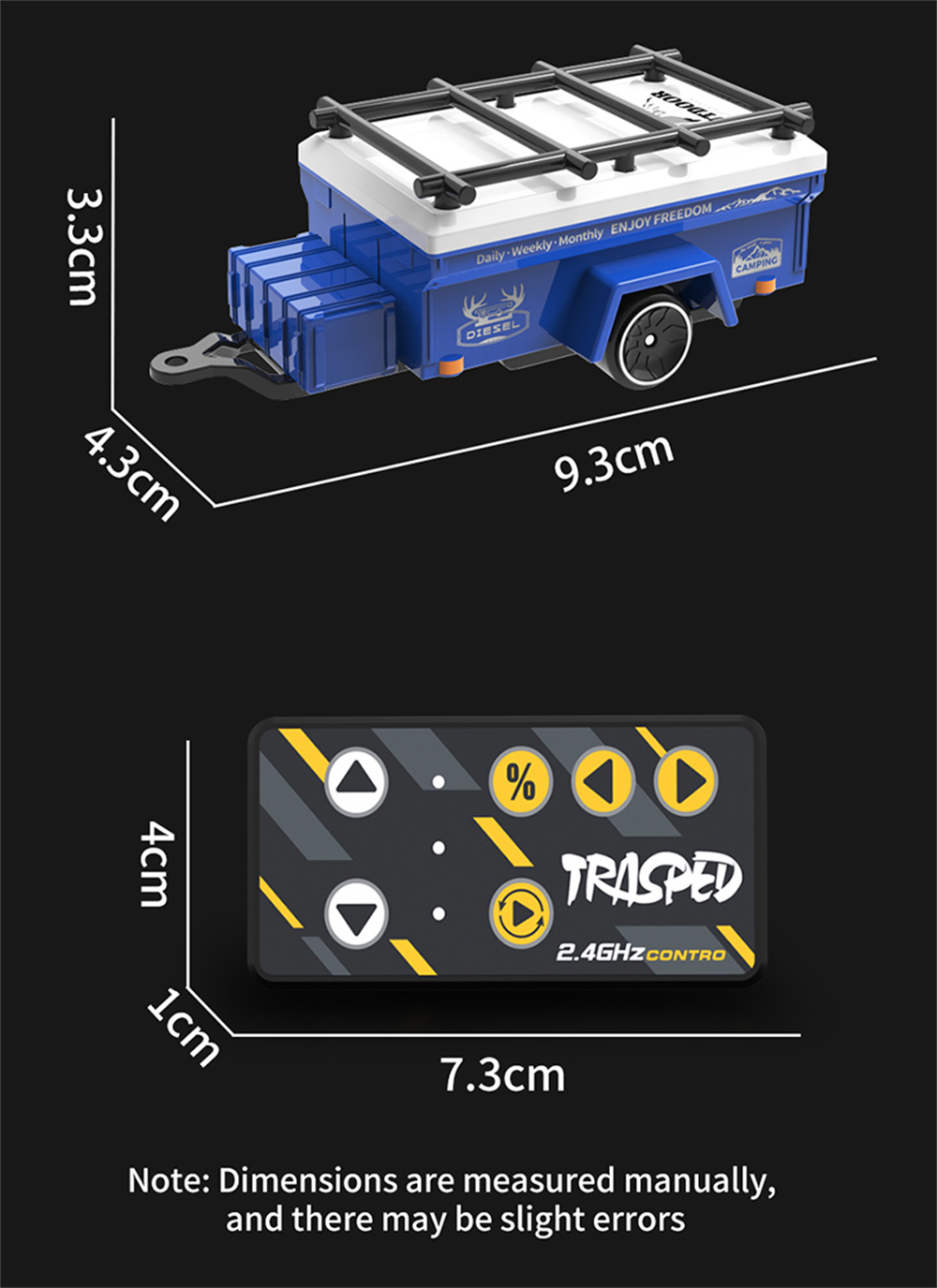 Car Size:7.5*3.4*2.7cm Trailer Size:9.3*4.3*3.3cm Remote Controller Size:7.3*4*1cm Box Size:10.5*6*6.5cm/12.6*6*8cm |