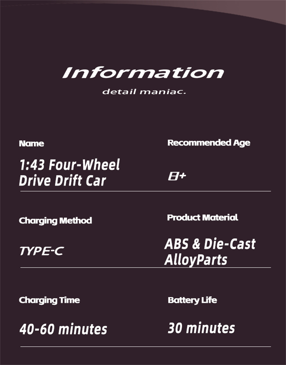 Models:M4(Purple) / M5(Silver) Model:1/43 Speed:15-20km/h |