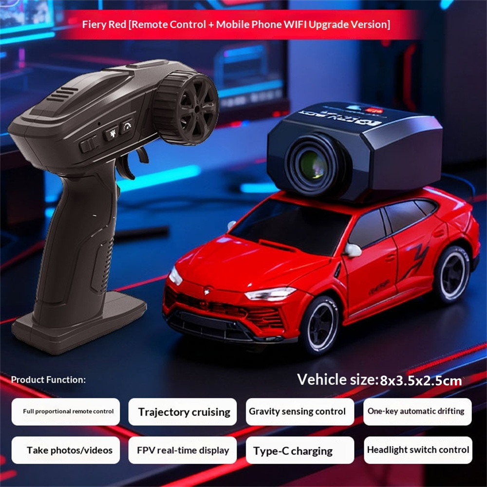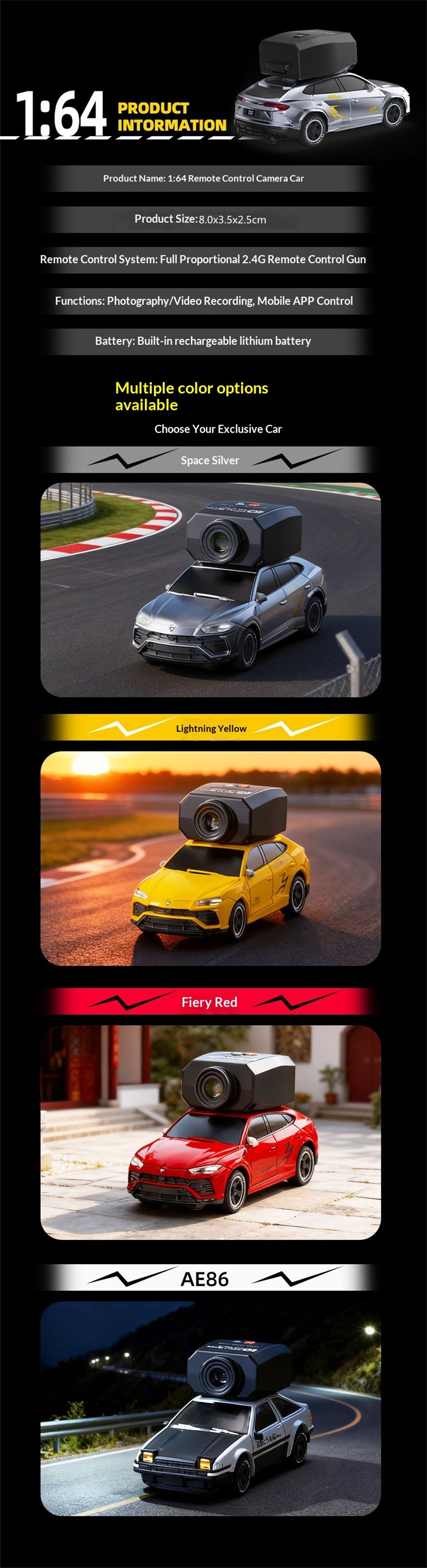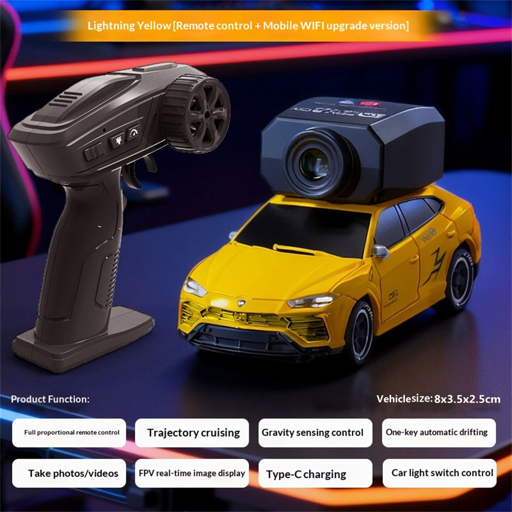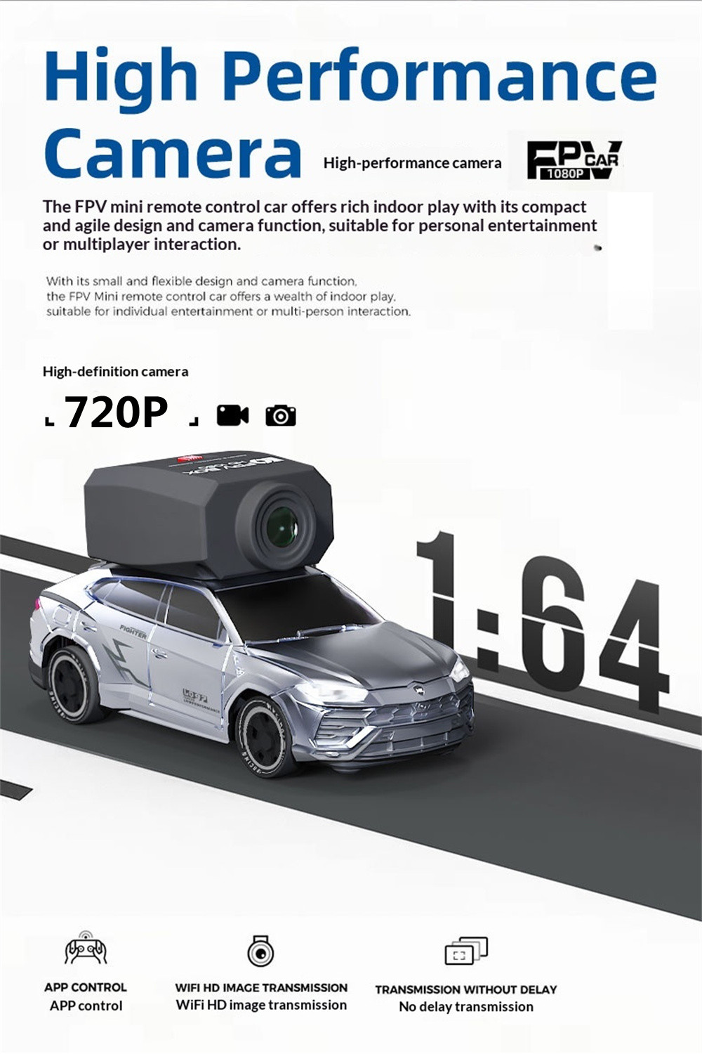 1. 1/64 scale 4WD drift car, full-scale control system, 720P magnetic HD camera, real-time video and photo recording via app.