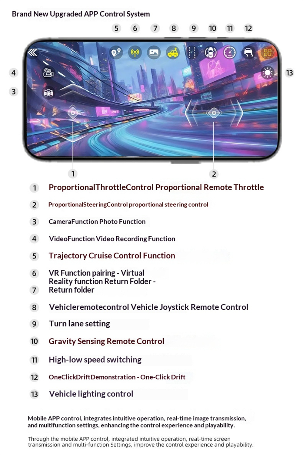 Forward, backward, left turn, right turn, drift, adjustable speed and steering, video recording, app remote control and various app functions, simulated car lights.