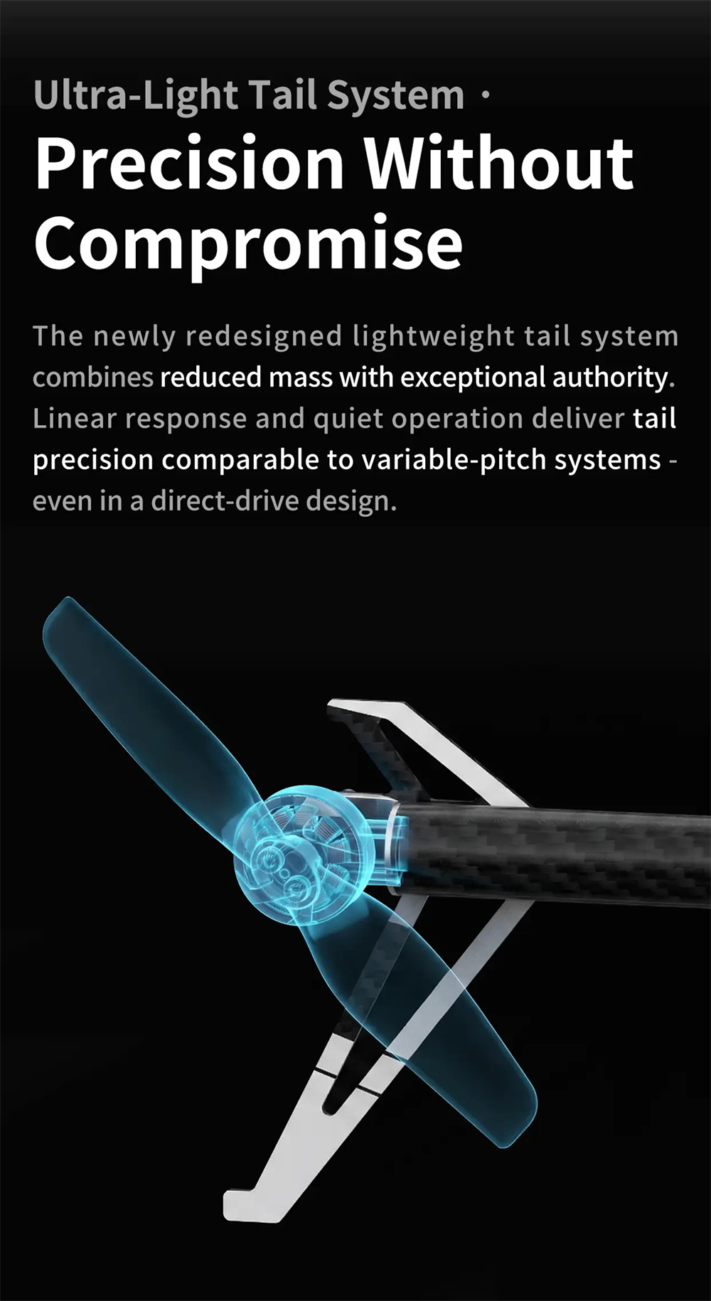 2> Ultra-Light Tail System: Redesigned lightweight tail system delivers exceptional precision with minimal noise, comparable to variable-pitch systems in a direct-drive format.
