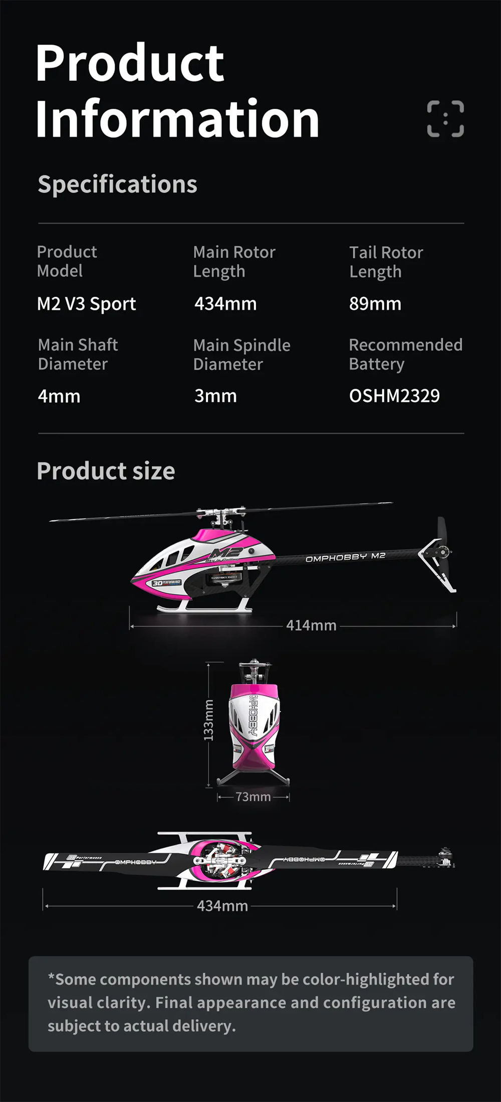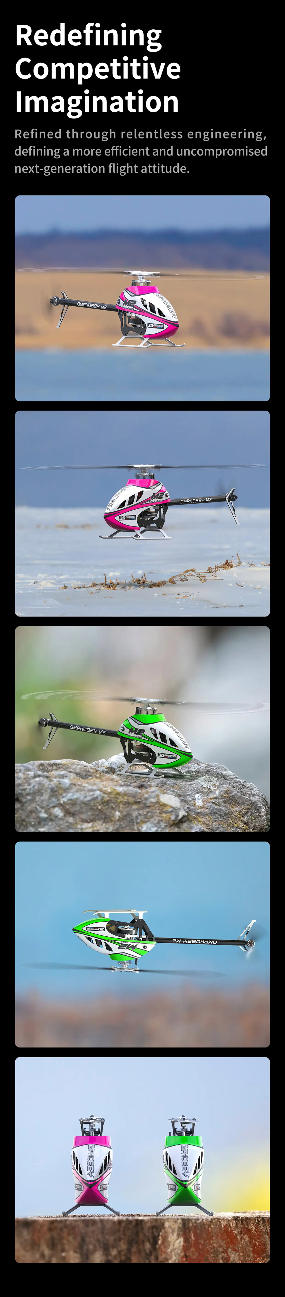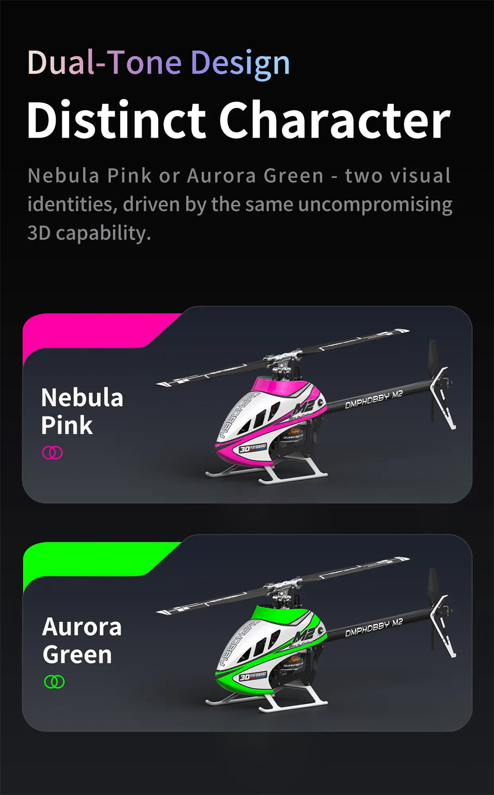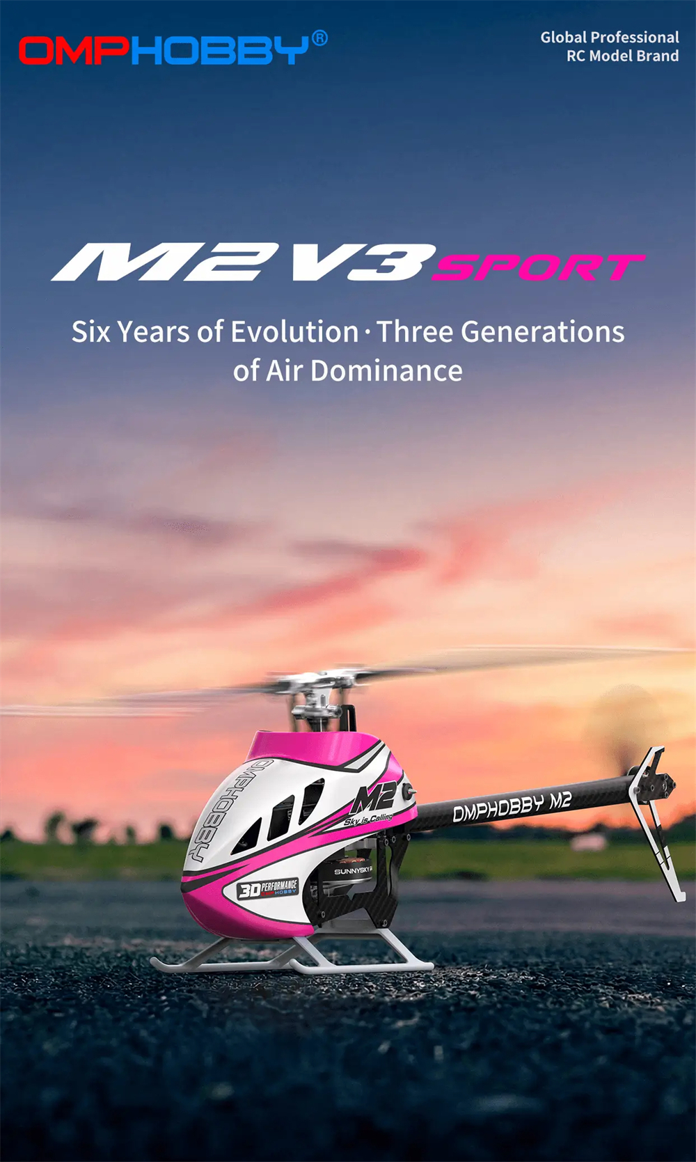 OMPHOBBY M2 V3 Sport 3D RC helicopter, evolved over 6 years with 3-gen air dominance. Boasts OFS3 flight control, pro main rotor, high-efficiency motor & ultra-light tail system. Available in Nebula Pink/Aurora Green, with precise flight performance and sleek dual-tone designs.
