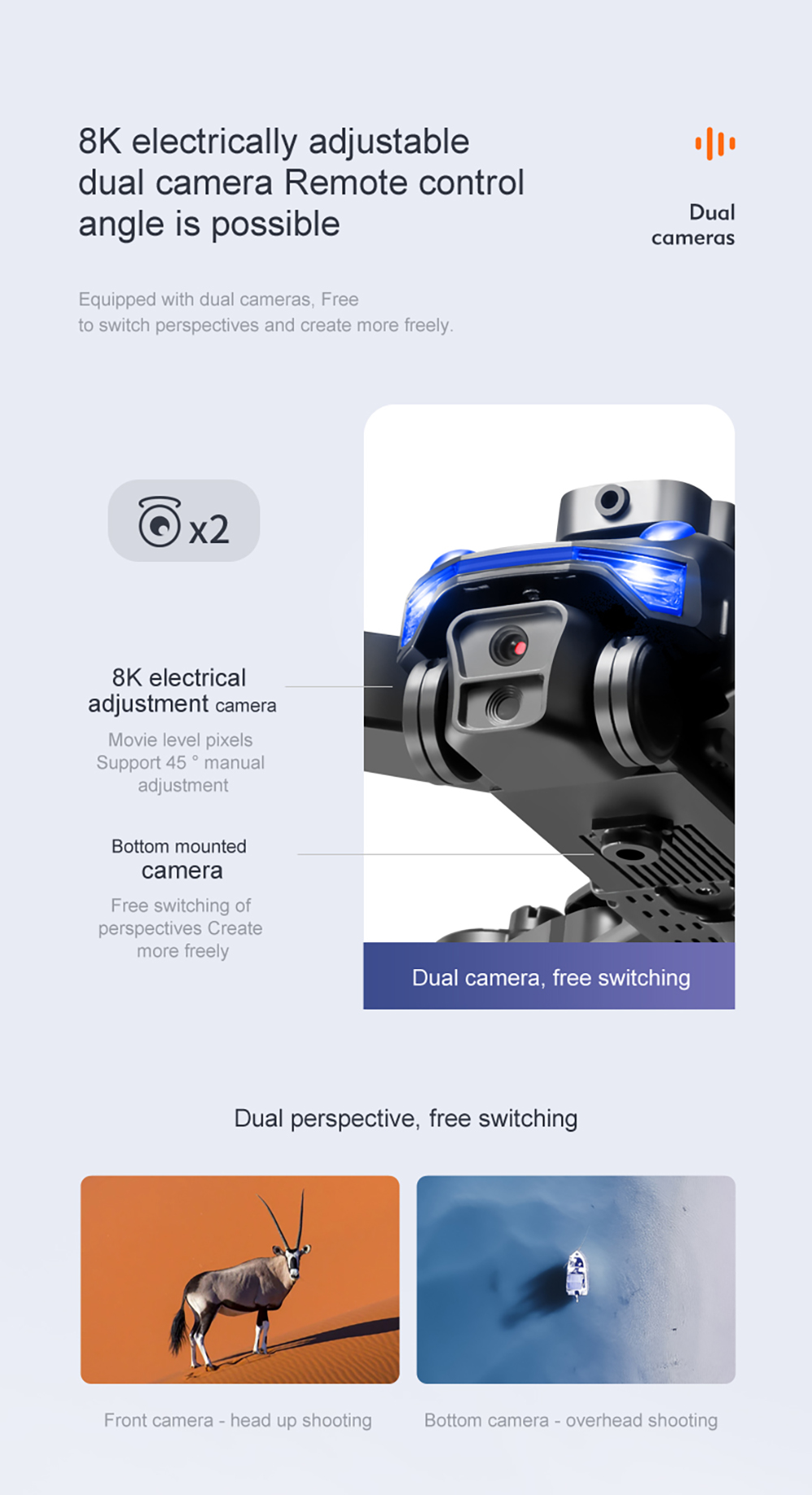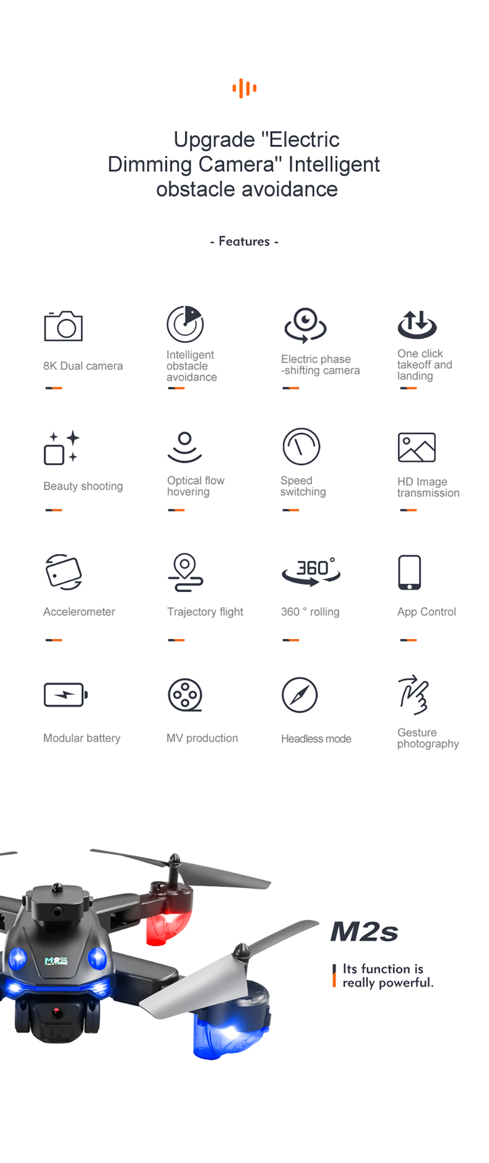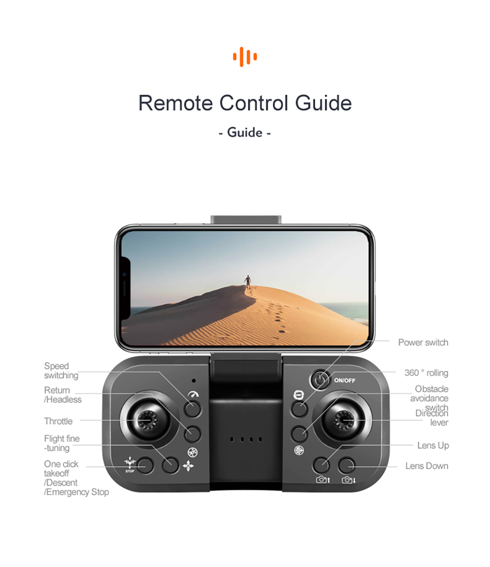 Function: up/down, front/back, left/right turn, lateral flight, headless mode, altitude hold mode, WiFi FPV (dual lens with dual lens switching function), and electric lens adjustment function.