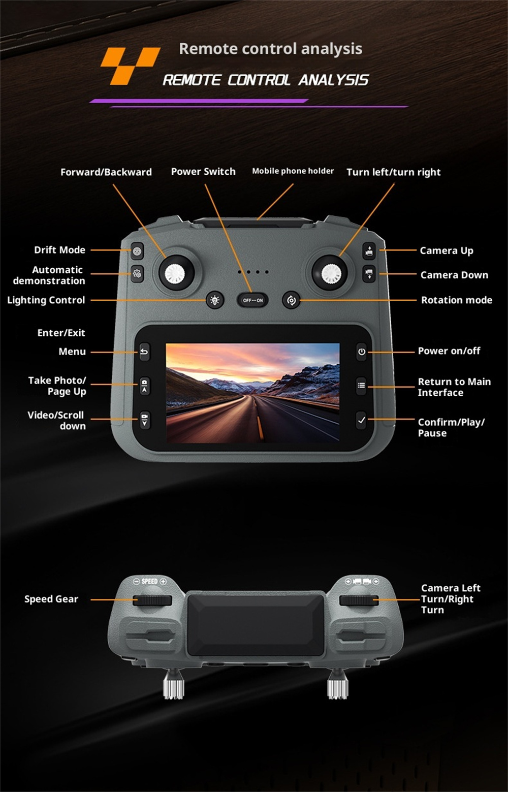 Remote control with screen display; camera can rise, fall, rotate left and right; takes photos and records videos; supports SD cards.