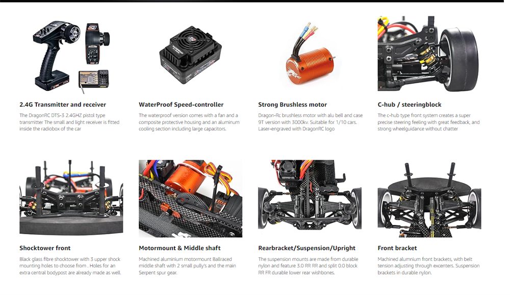 ESC:Dragon-RC 211009 Speedo DX-10 WP 45A with fan Servo:Dragon-RC 210003 digital servo 0.13s – 6kg |