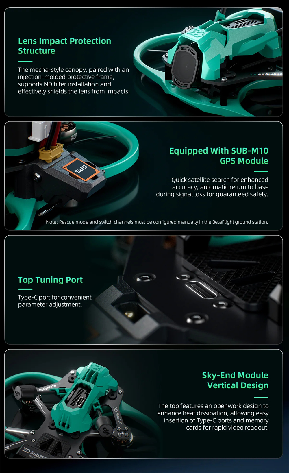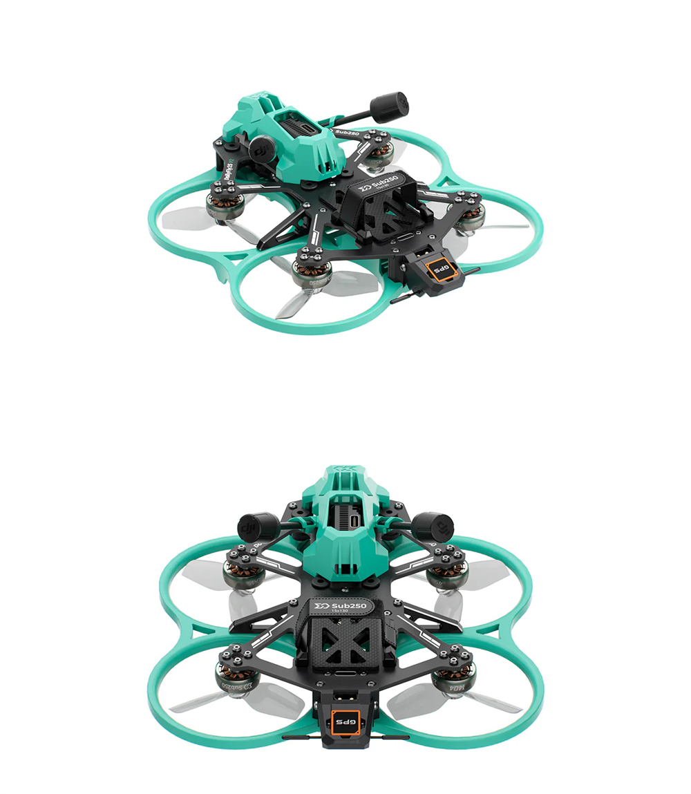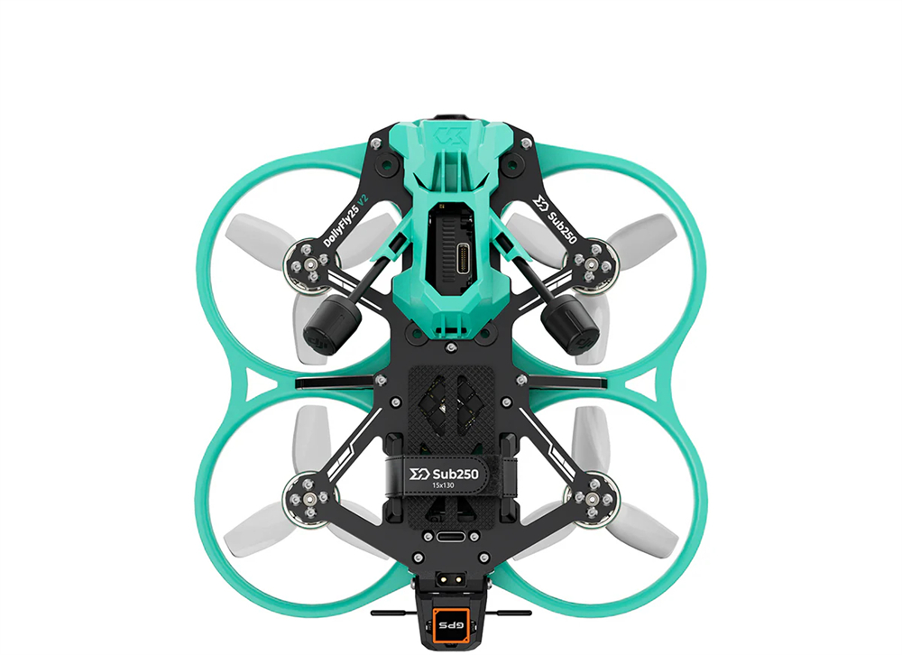 At the rear of the frame, a dedicated GPS mount is designed to accommodate the SUB250 M10 GPS, enabling Betaflight Rescue Mode and providing additional safety during flight.