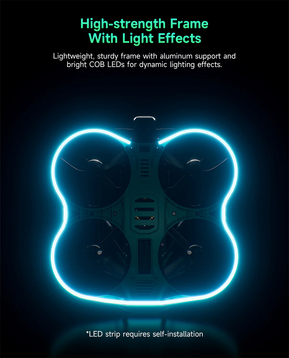 The integrated protective frame, made from modified materials, combines high toughness with strength, effectively preventing damage from high-speed propellers. It also supports embedded COB light strips, adding extra visual flair to your flights.