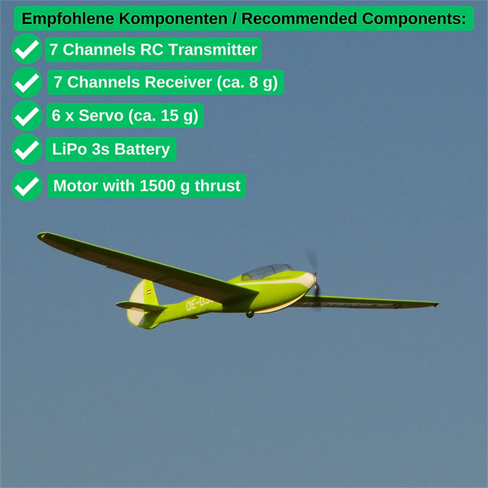 The Musger Mg-19B has a filigree construction and is only suitable for slope flying and motor towing to a limited extent (due to the filigree construction).