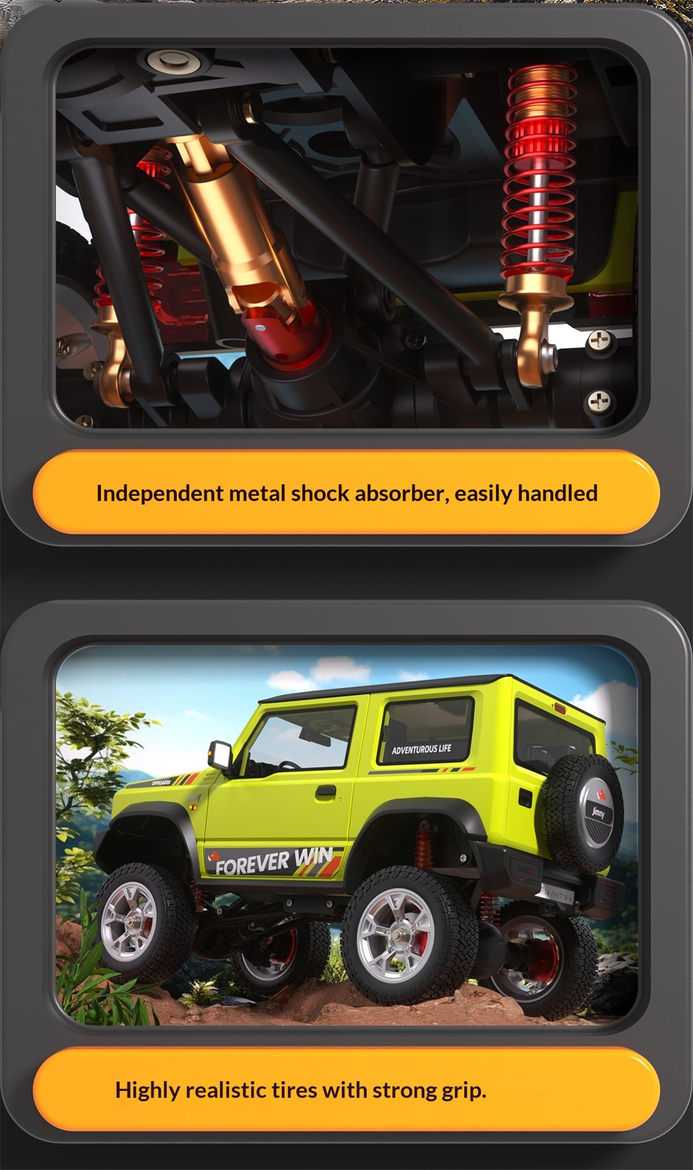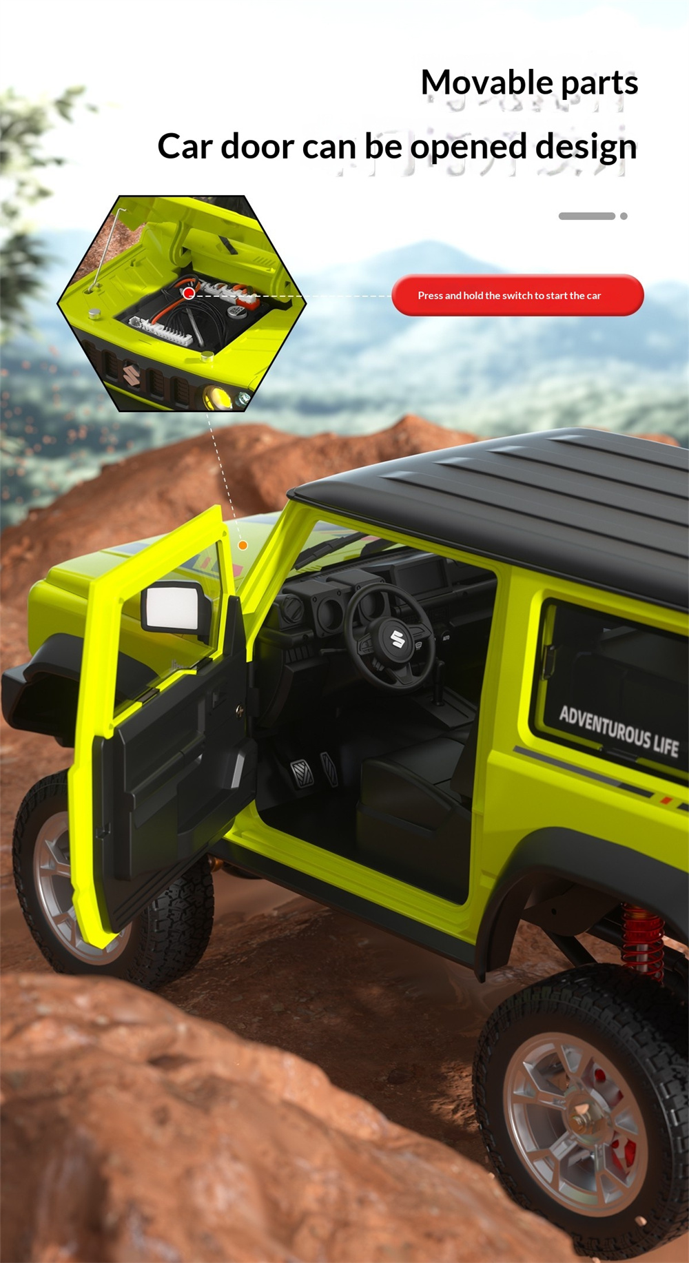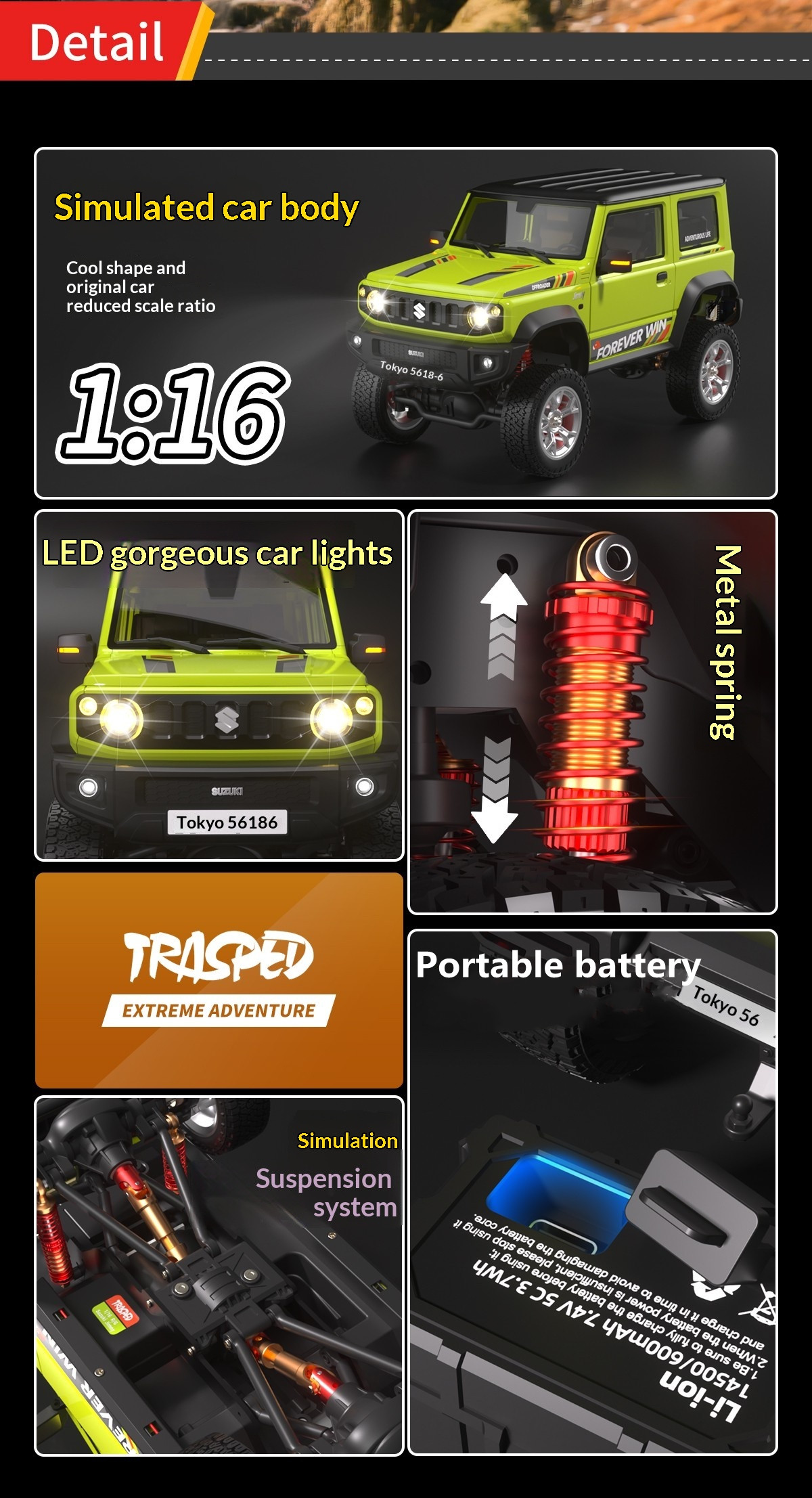 TRASPED HG4-210 RTR 1/16 2.4G 4WD RC Car for SUZUKI JIMNY Rock Crawler LED Light Simulated Smoking Sound Metal Gears Oil Filled Shocks Drive Shaft Wheel Rims Off-Road Climbing Truck Vehicles Models Toys