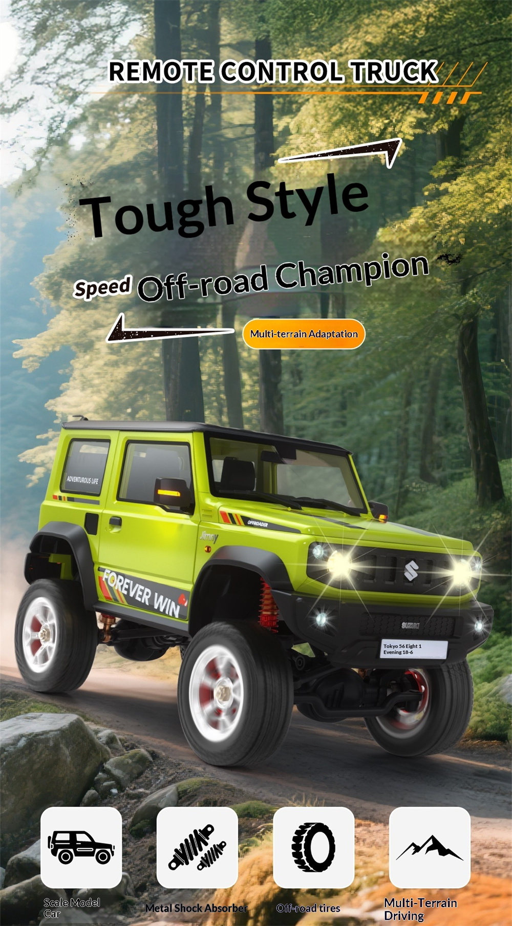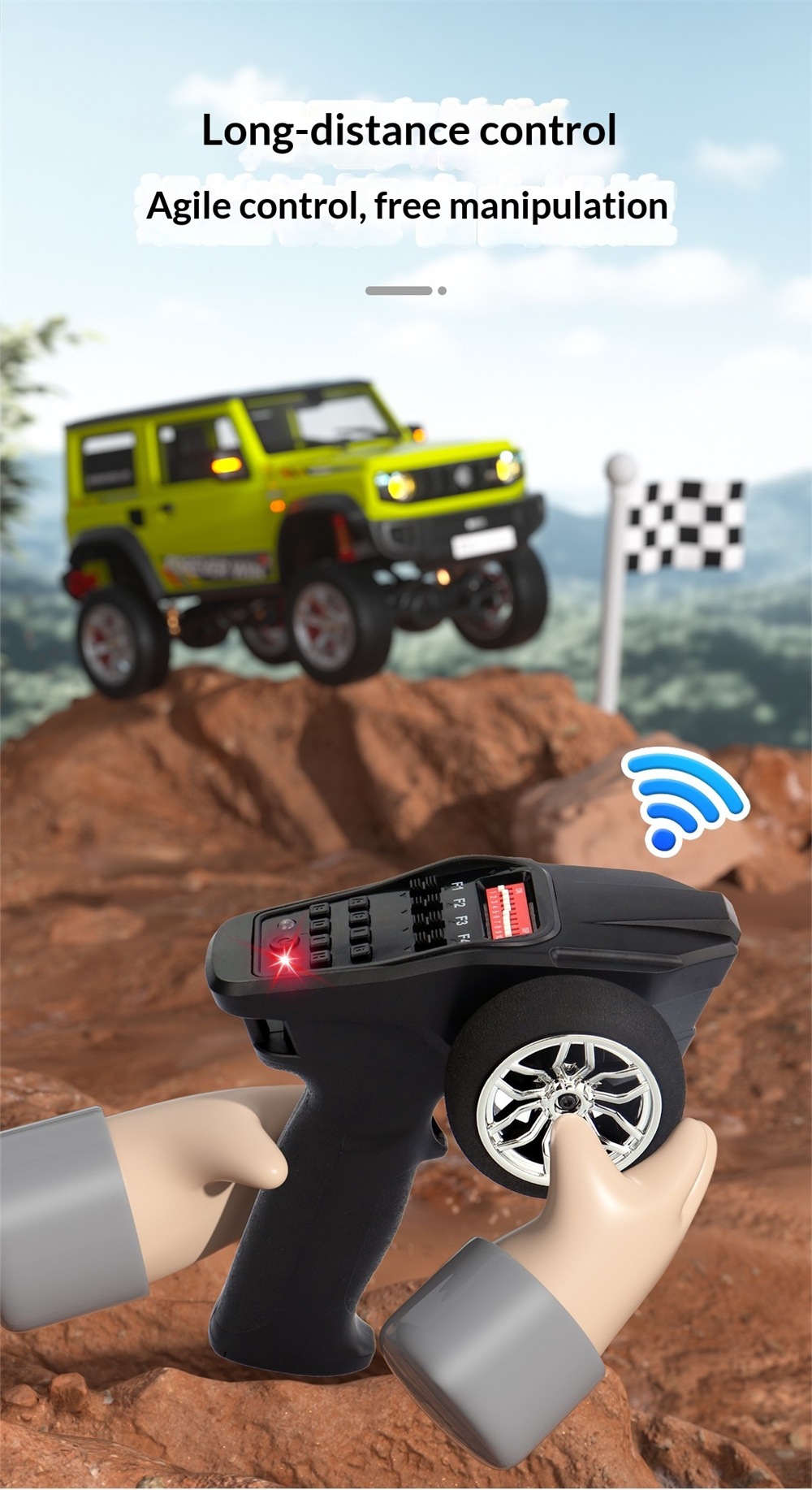 The model car is equipped with full proportional control functions for forward, backward, left and right steering, and 4-wheel drive without differential.