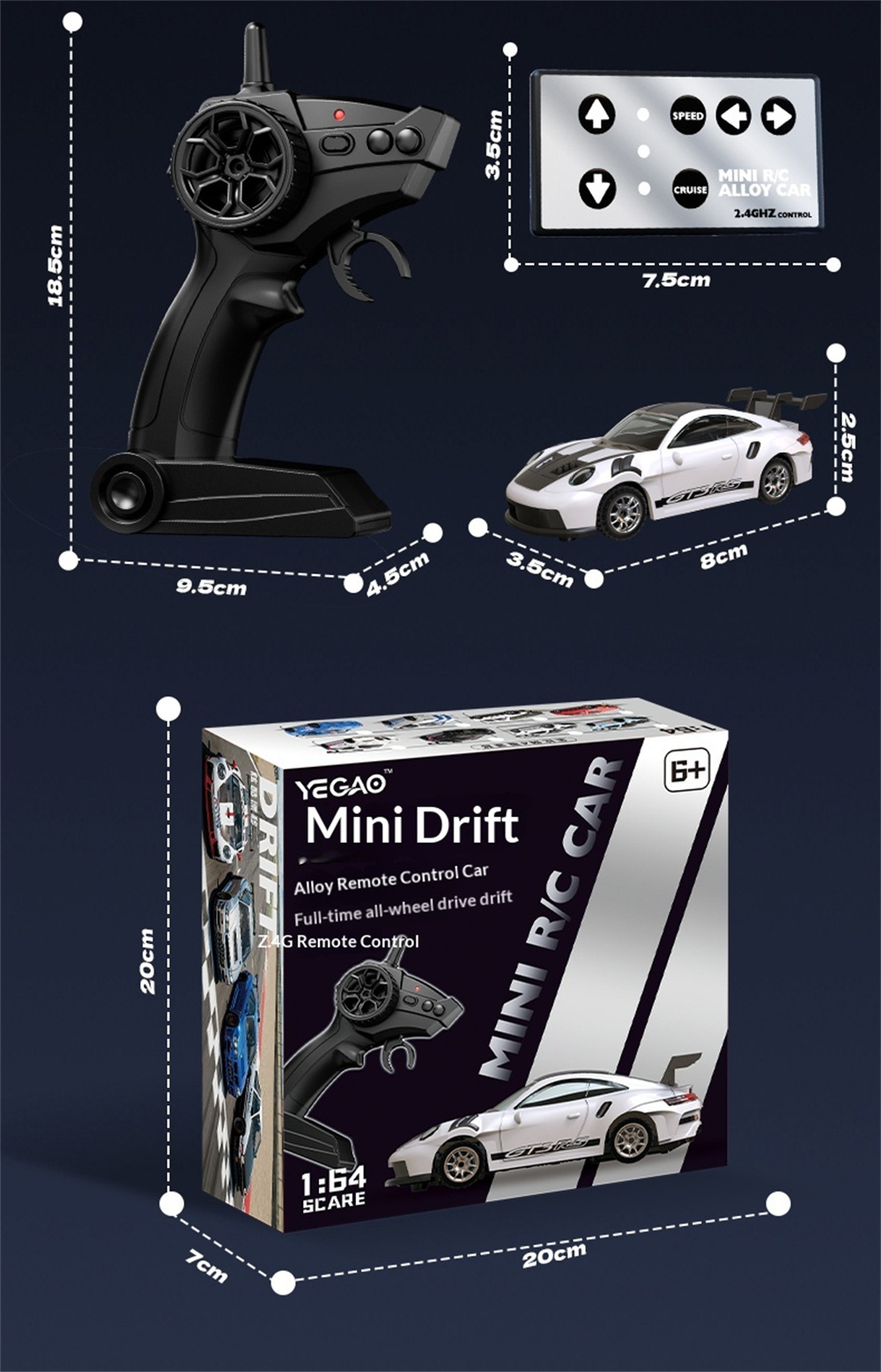 Car Size:8*3.5*2.5cm Remote Controller Size:18.5*9.5*4.5cm Box Size:20*20*7cm |