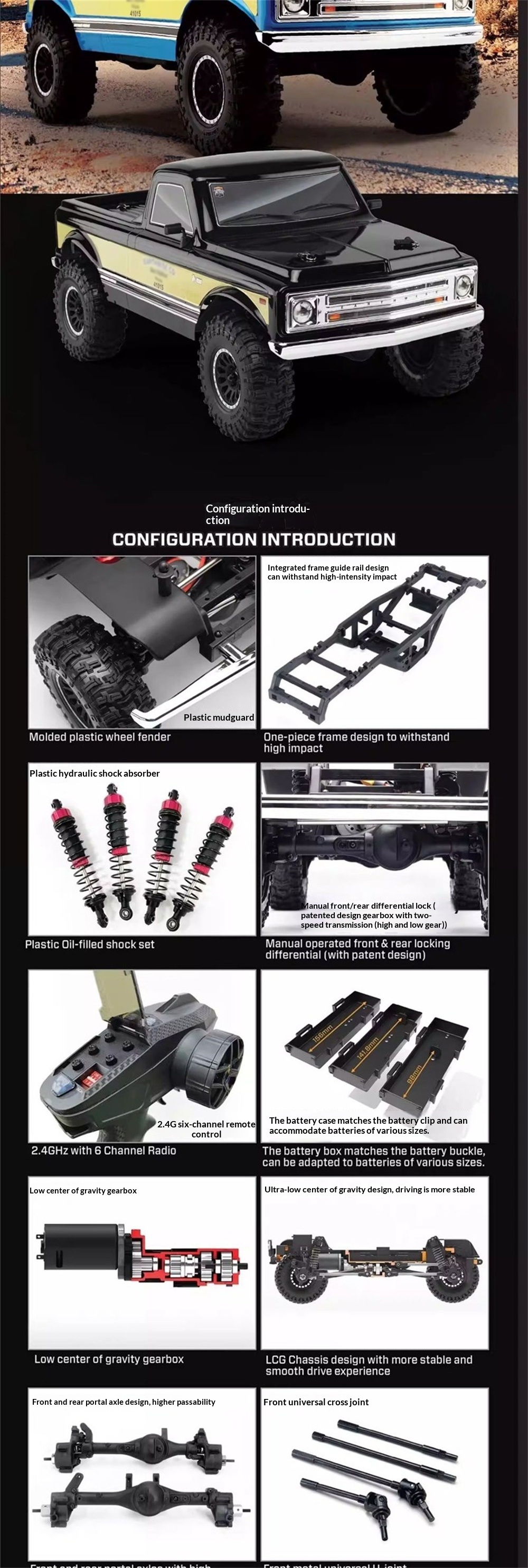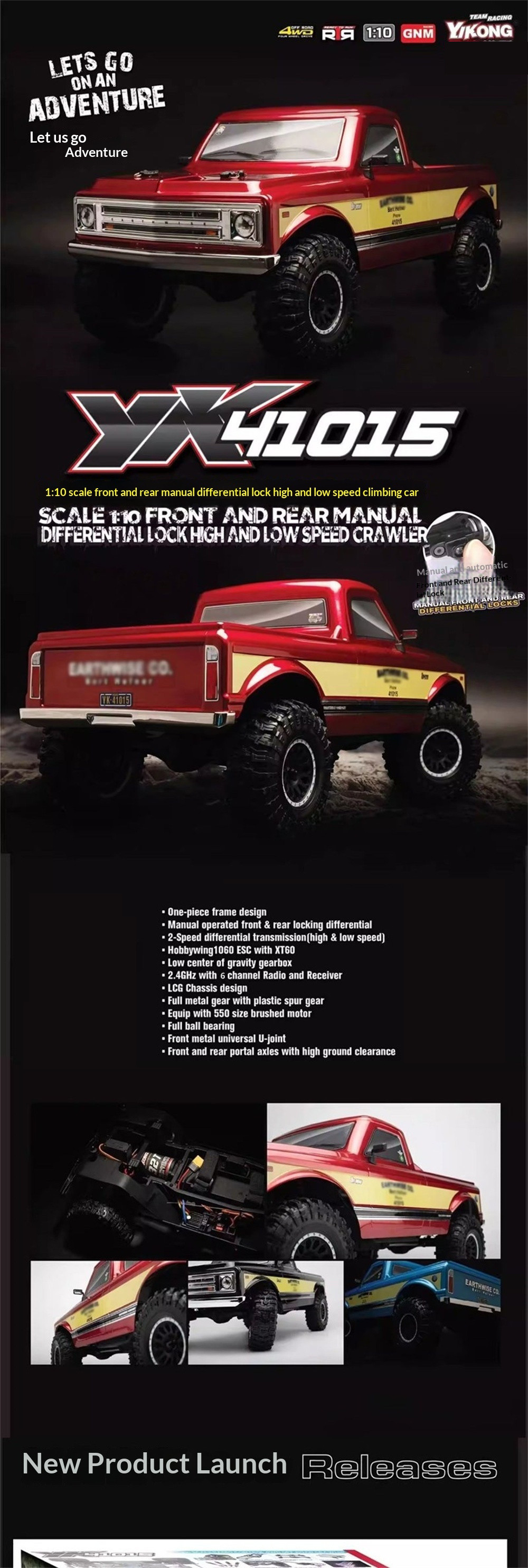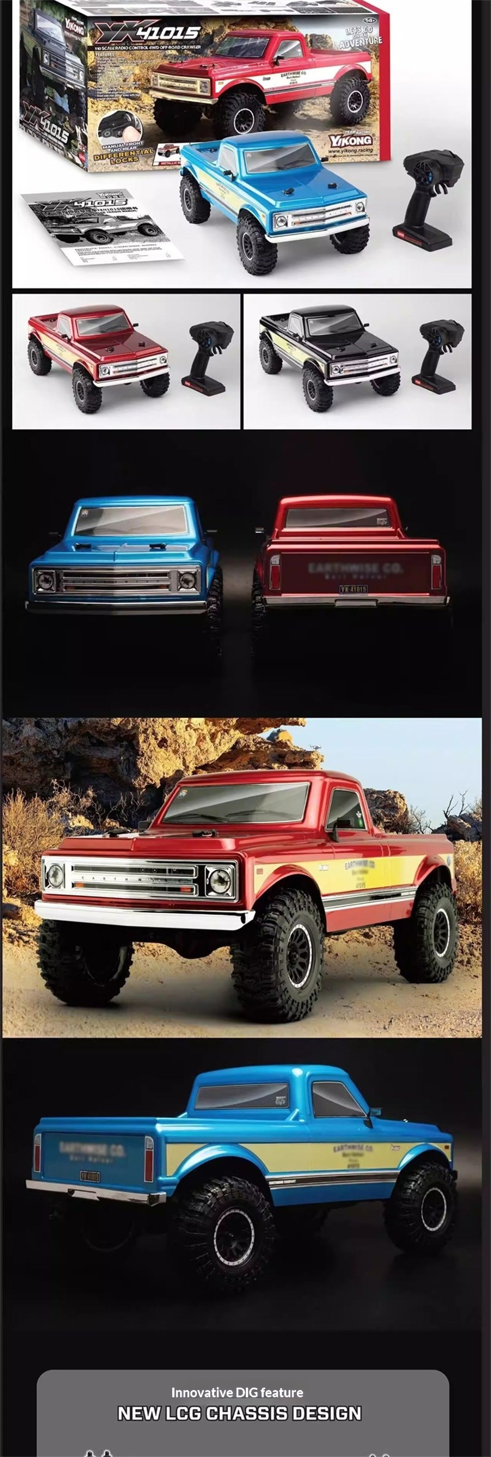 The Yikong YK41015 is a 1/10 scale 4WD crawler with a classic American off-road design. It features portal axles, a 2-speed transmission, manually lockable differentials, and a Hobbywing 60A ESC. With a low center of gravity and strong stability, it performs excellently on rocks, mud, and trails.