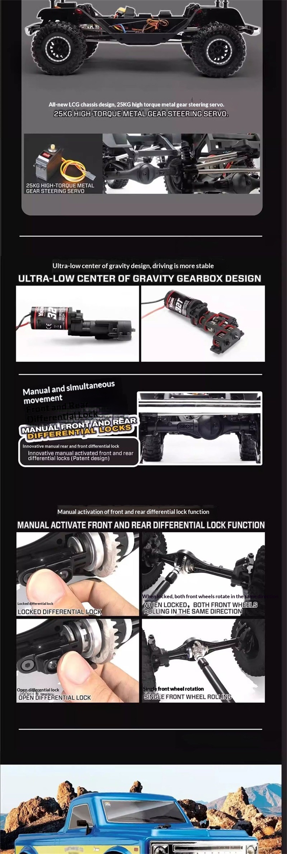 - Manually lockable differentials for max traction and tight turning