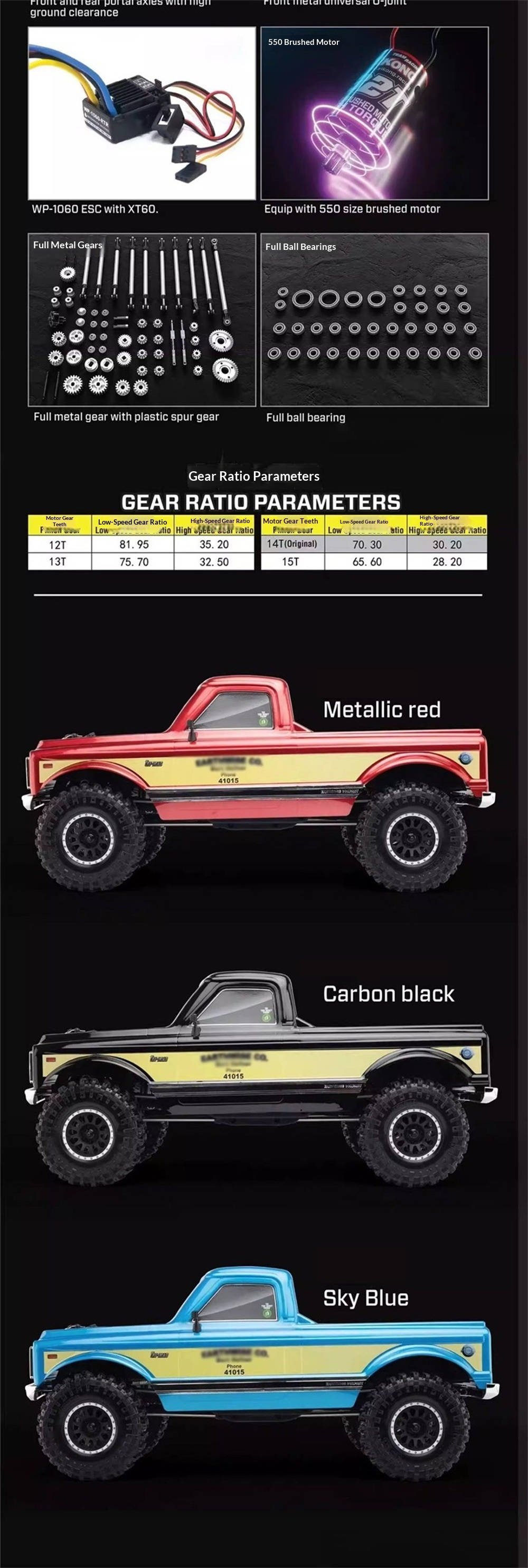 ESC:Hobbywing 60A WP-1060 waterproof esc(crawler mode) Motor:550 brushed motor Servo:25KG high torque metal gear steering servo |