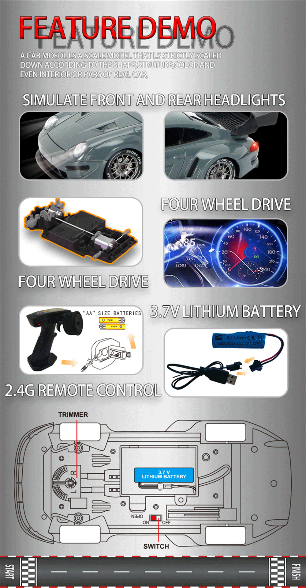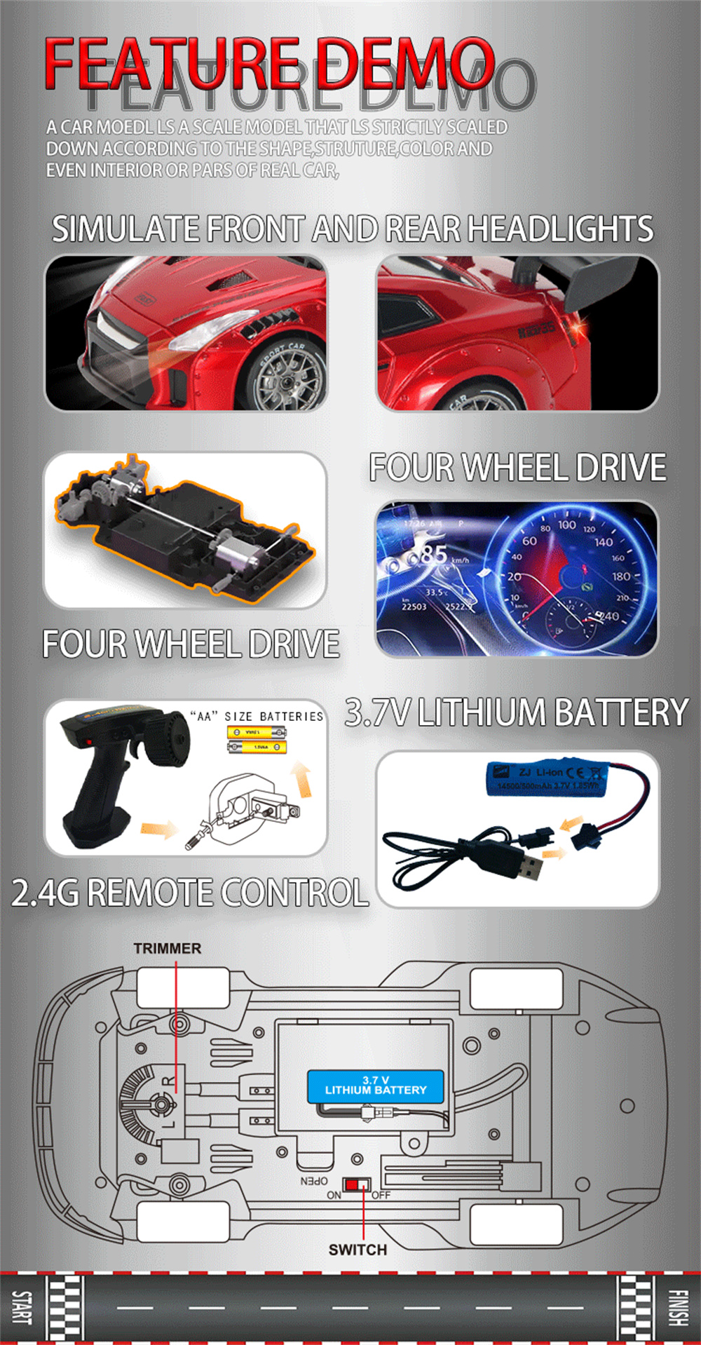 Battery | Battery for the Car:3.7V 500mAh Li-ion battery(included) Battery Charging Time:About 2.5 hours Battery Playing Time:Approx.20 minutes |