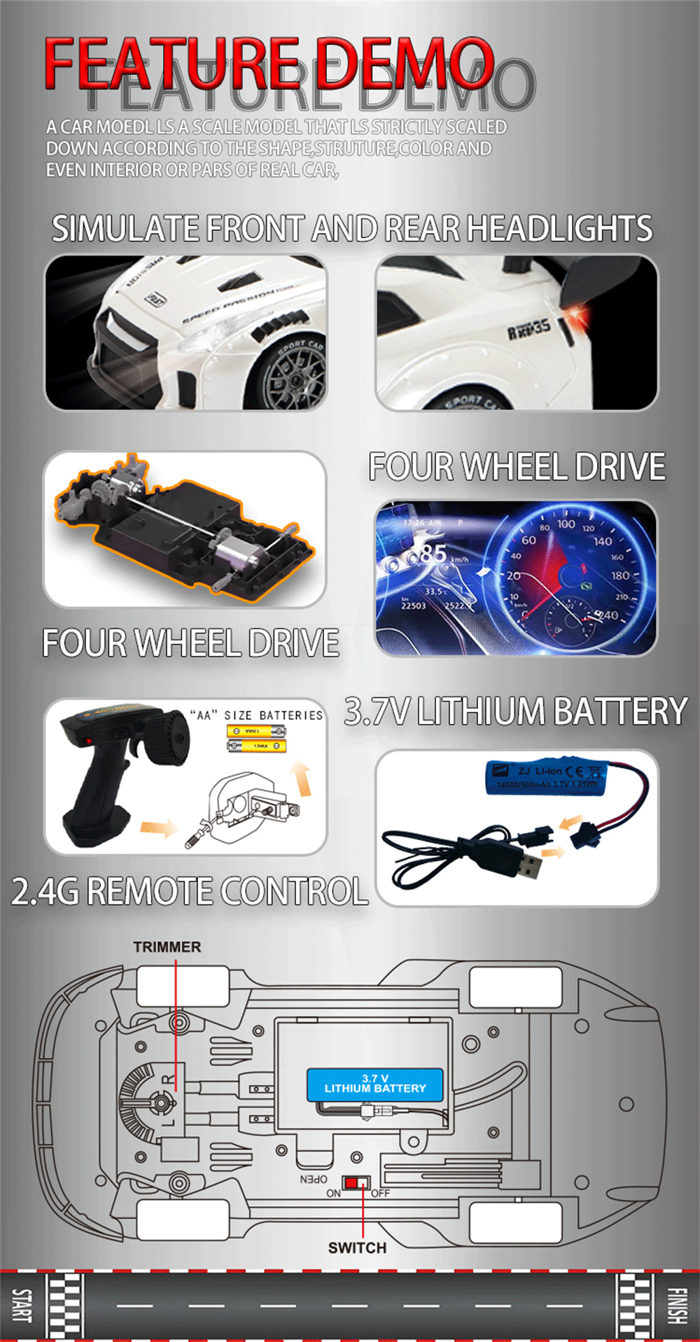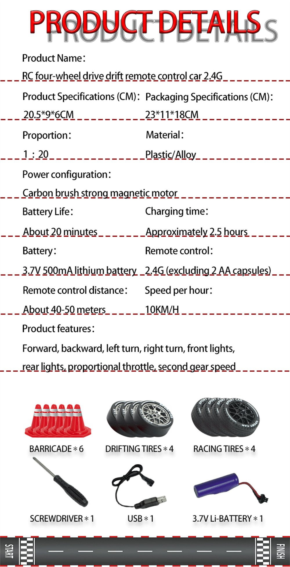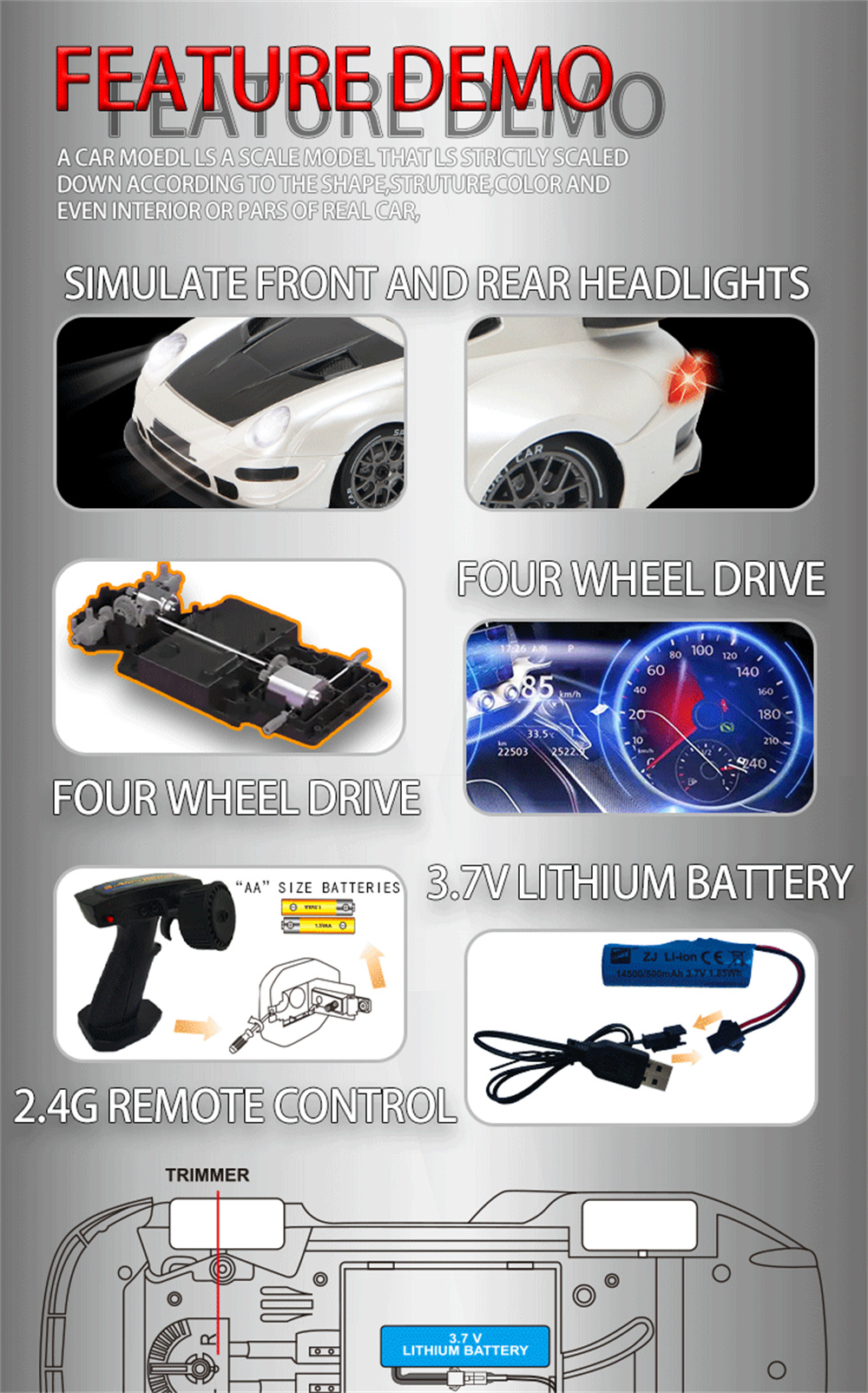 | Basic information | Brand:YOU SU Toys Item No:US020 Scale:1/20 Color:White,grey,purple,red Max Speed:10km/h |