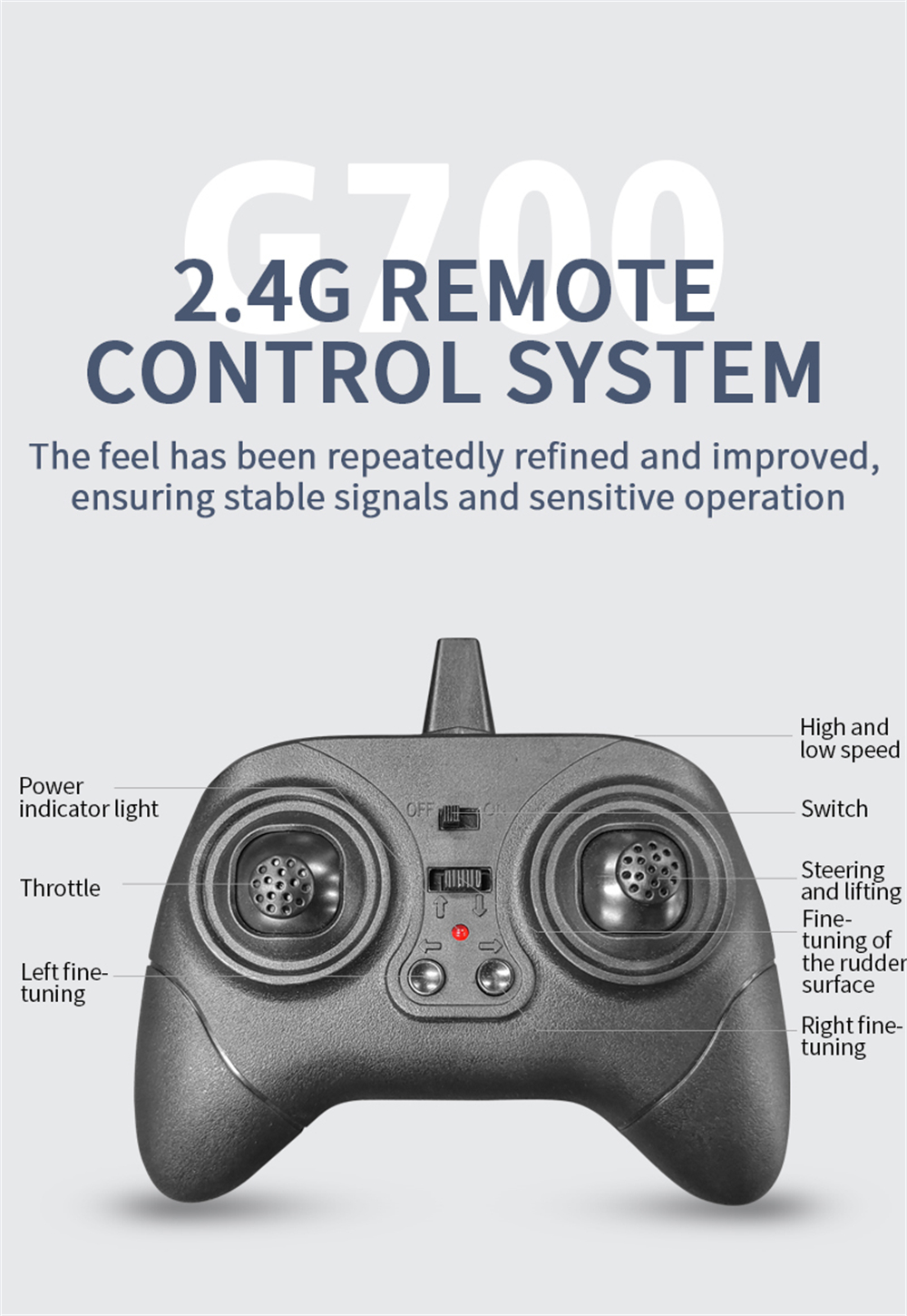 7. 2.4G receiver with built-in gyroscope for simpler and easier operation.