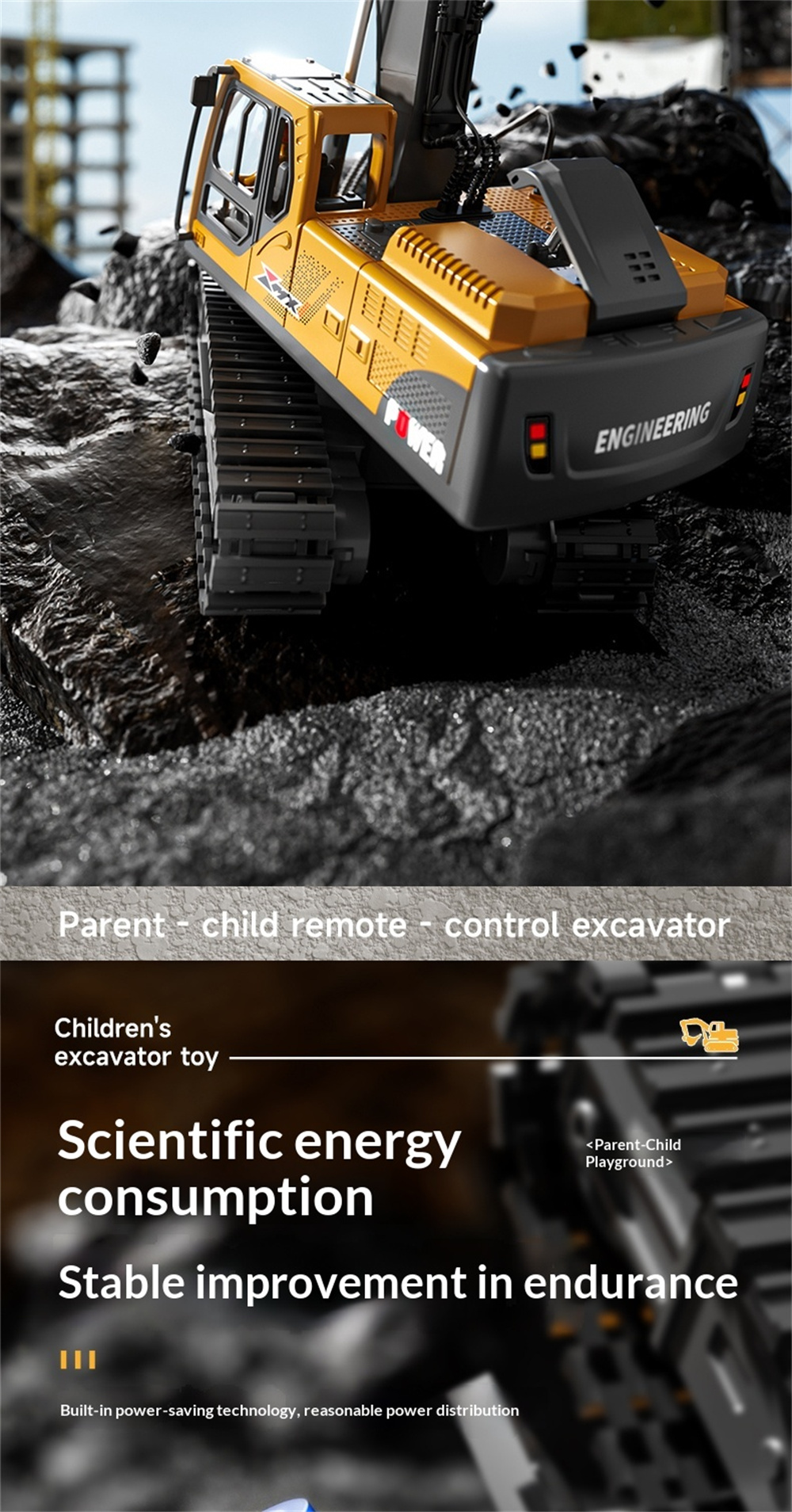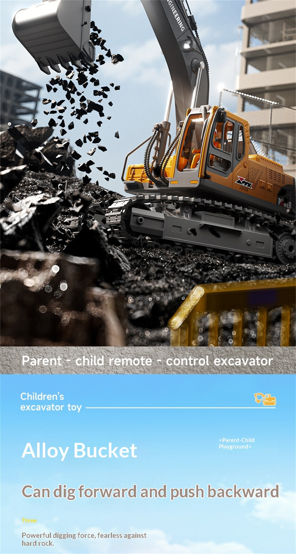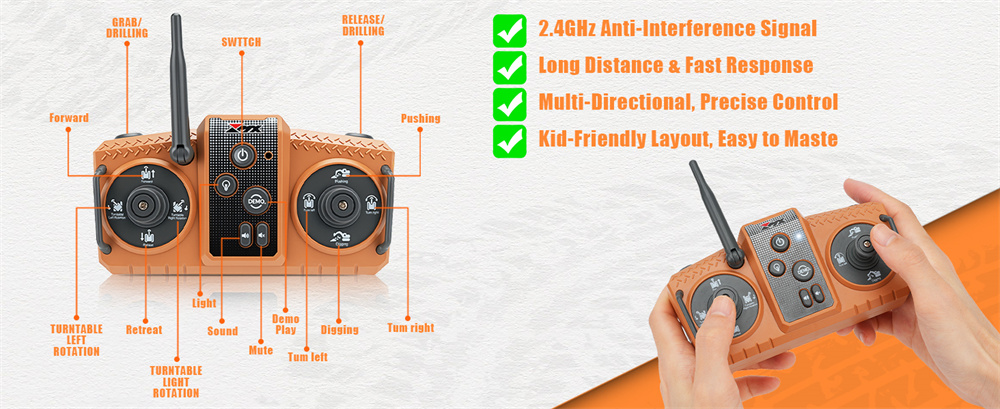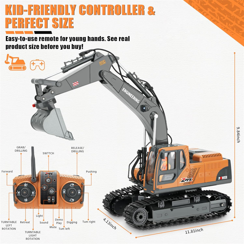 Battery | Battery for the Excavator:3.7V 1200mAh Li-ion battery(included) Battery Charging Time:About 1.5 hours Battery Playing Time:Approx. 15-20 minutes |