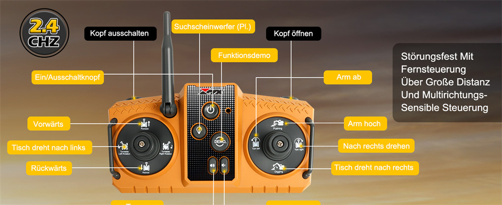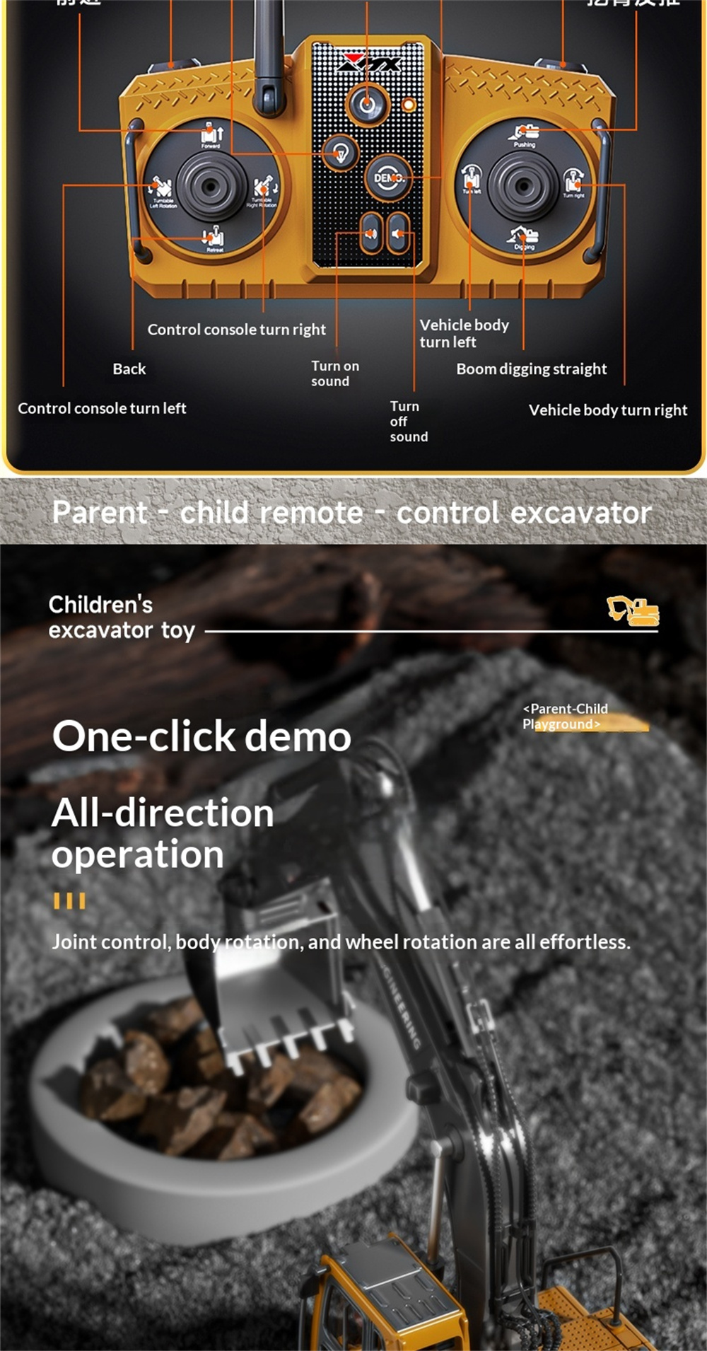 3. Forward and backward movement, left and right turning, simulated excavator arm extension for digging, and tower rotation