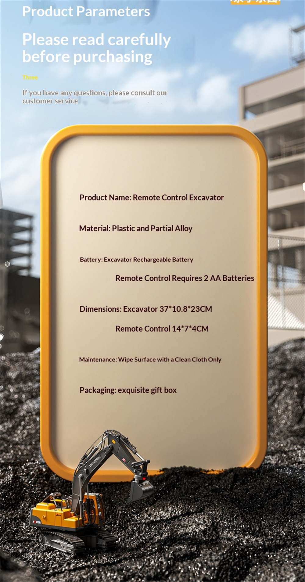 Excavator Size:40*11*24cm 3-In-1 Excavator Size:26*18*11cm,arm span max length 36cm Box Size:35*11.5*16.5cm |